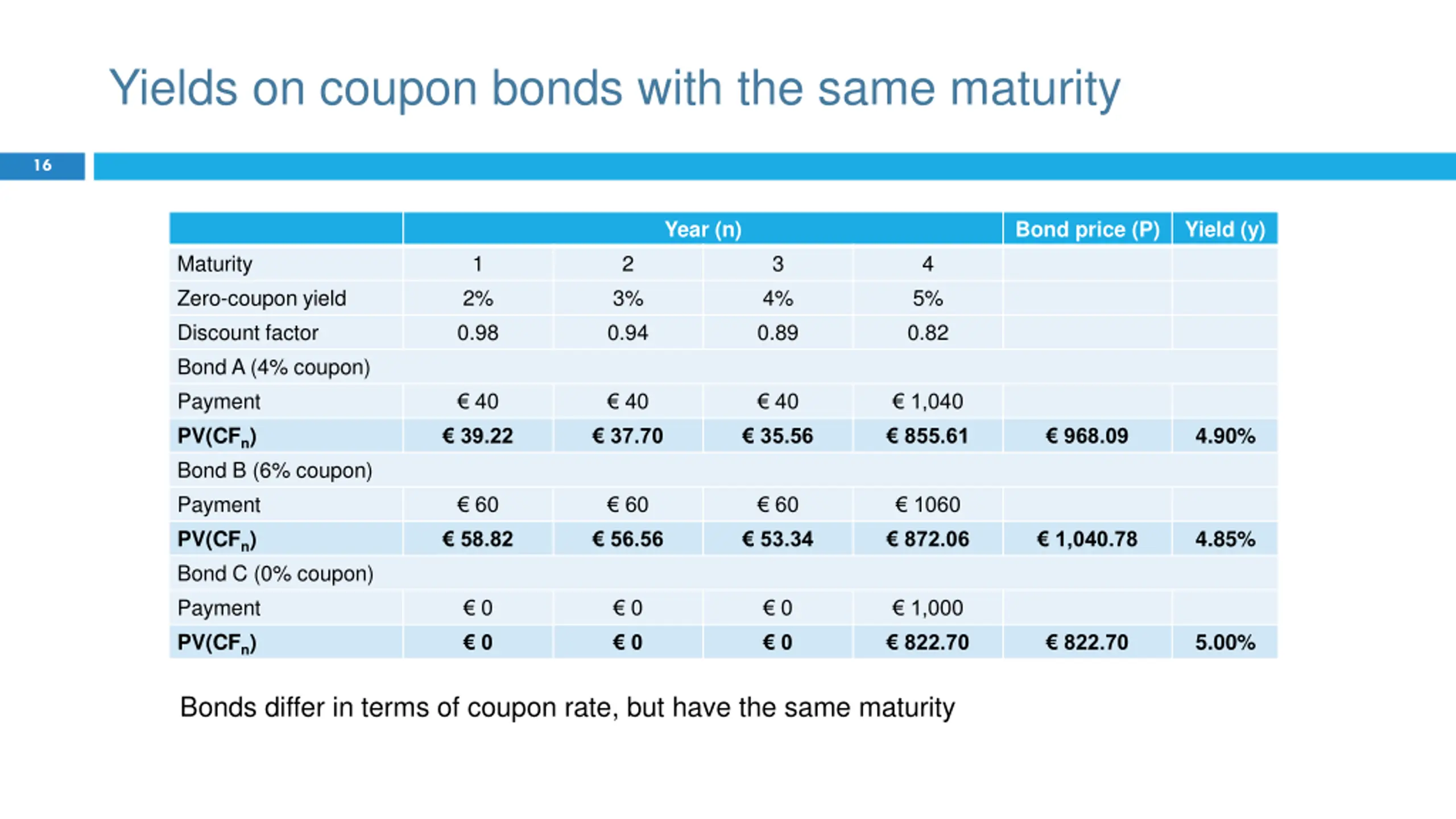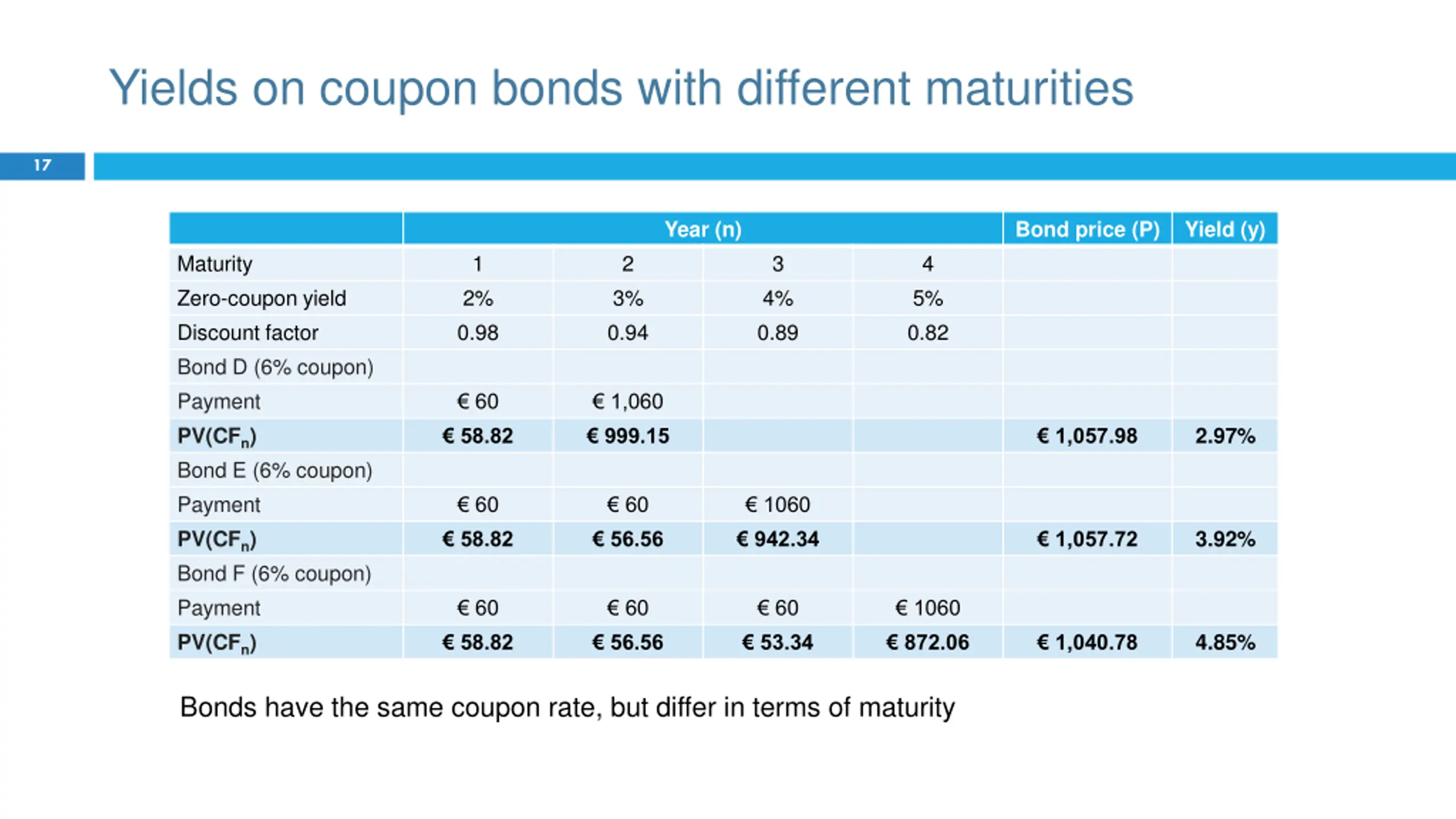 Yields on coupon bonds with different maturities 17 Year (n) Bond price (P) Yield (y) Maturity Zero-coupon yield Discount factor Bond D (6% coupon) Payment PV(CFn) Bond E (6% coupon) Payment PV(CFn) Bond F (6% coupon) Payment PV(CFn) 1 2 3 4 2% 0.98 3% 0.94 4% 0.89 5% 0.82 60 58.82 1,060 999.15 2.97% 1,057.98 60 58.82 60 56.56 1060 942.34 3.92% 1,057.72 60 58.82 60 56.56 60 53.34 1060 872.06 4.85% 1,040.78 Bonds have the same coupon rate, but differ in terms of maturity