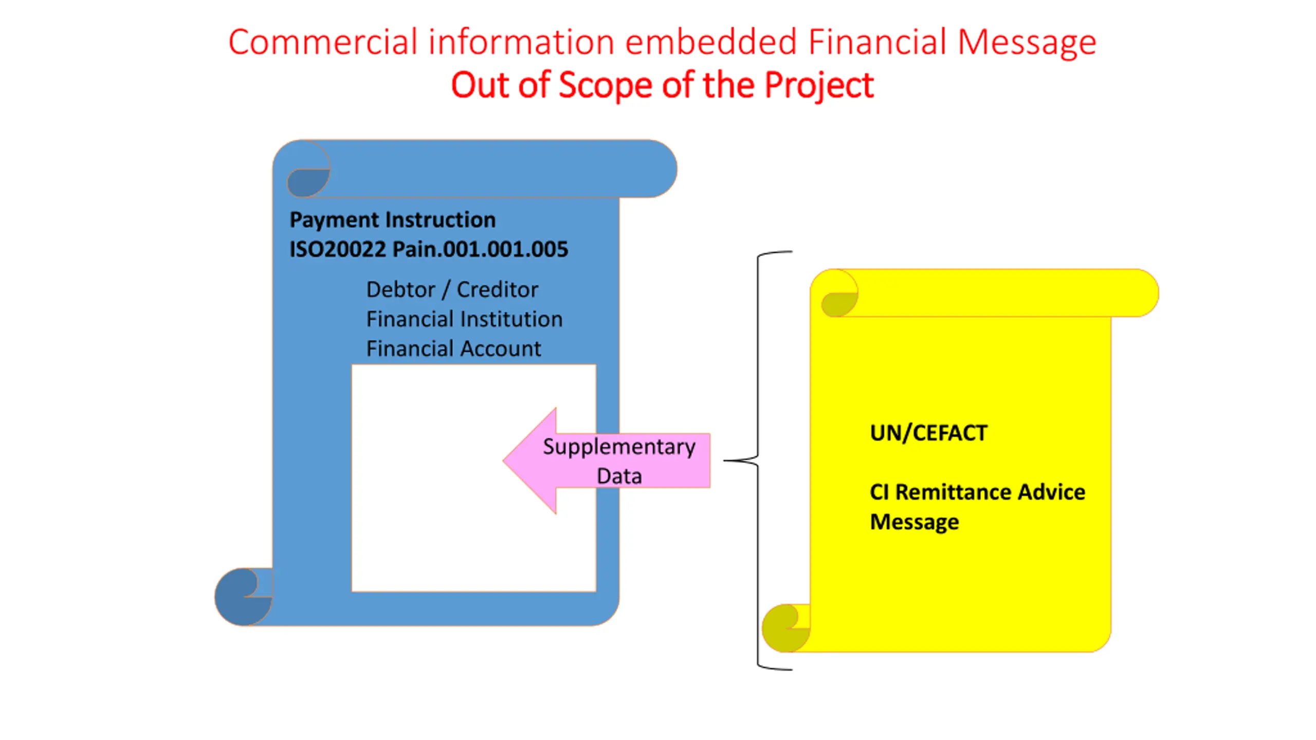 Commercial information embedded Financial Message Out of Scope of the Project Out of Scope of the Project Payment Instruction ISO20022 Pain.001.001.005 Debtor / Creditor Financial Institution Financial Account UN/CEFACT Supplementary Data CI Remittance Advice Message