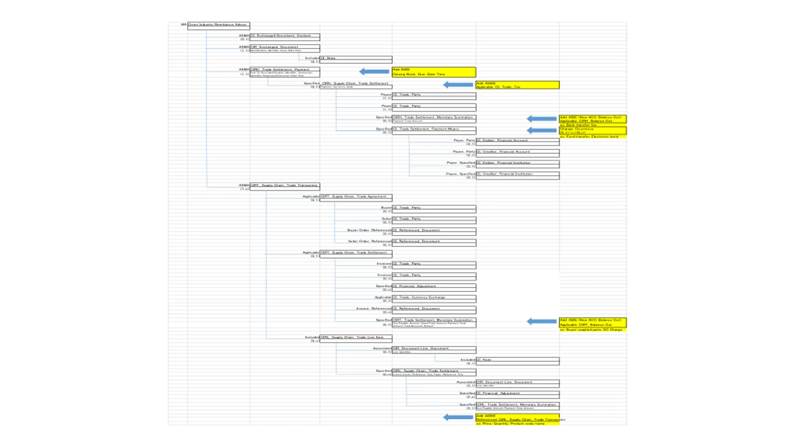MA Cross Industry Remittance Advice ASMA CI_ Exchanged Document_ Context (0..1) ASMA CIR_ Exchanged_ Document (1..1) Identification. Identifier, Issue. Date Time Included CI_ Note (0..1) ASMA CIRH_ Trade Settlement_ Payment (1..1) Identifier, Requested Execution. Date Time Add: BBIE Closing Book_ Due. Date Time End-To-End_ Identification. Identifier, Instruction. Specified CIRH_ Supply Chain_ Trade Settlement (0..1) Payment_ Currency. Code Add: ASBIE Applicable. CI_ Trade_ Tax Payee CI_ Trade_ Party (1..1) Payer CI_ Trade_ Party (1..1) Specified CIRH_ Trade Settlement_ Monetary Summation (0..1) Payment Total. Amount Add: ABIE (New ACC: Balance Out) Applicable. CIRH_ Balance Out ex. Bank transfer fee Change: Ocurrence (0..1) ==>(0..n) ex. Fund transfer, Electronic bond Specified CI_ Trade Settlement_ Payment Means (0..1) Payer_ Party CI_ Debtor_ Financial Account (0..1) Payee_ Party CI_ Creditor_ Financial Account (0..1) Payer_ Specified CI_ Debtor_ Financial Institution (0..1) Payee_ Specified CI_ Creditor_ Financial Institution (0..1) ASMA CIRT_ Supply Chain_ Trade Transaction (1..n) Applicable CIRT_ Supply Chain_ Trade Agreement (0..1) Buyer CI_ Trade_ Party (0..1) Seller CI_ Trade_ Party (0..1) Buyer Order_ Referenced CI_ Referenced_ Document (0..1) Seller Order_ Referenced CI_ Referenced_ Document (0..1) Applicable CIRT_ Supply Chain_ Trade Settlement (0..1) Invoicee CI_ Trade_ Party (0..1) Invoicer CI_ Trade_ Party (0..1) Specified CI_ Financial_ Adjustment (0..n) Applicable CI_ Trade_ Currency Exchange (0..1) Invoice_ Referenced CI_ Referenced_ Document (0..n) Specified CIRT_ Trade Settlement_ Monetary Summation (0..1) Amount, Total Discount. Amount Add: ABIE (New ACC: Balance Out) Applicable. CIRT_ Balance Out Due Payable. Amount, Grand Total. Amount, Payment Total. ex. Buyer supplied parts, DC Charge, Included CIRL_ Supply Chain_ Trade Line Item (0..n) Associated CIR_ Document Line_ Document (0..1) Line. Identifier Included CI_ Note (0..1) Specified CIRL_ Supply Chain_ Trade Settlement (0..n) Invoice Issuer_ Reference. Text, Payer_ Reference. Text Associated CIR_ Document Line_ Document (0..1) Line. Identifier Specified CI_ Financial_ Adjustment (0..n) Specified CIRL_ Trade Settlement_ Monetary Summation (0..1) Due Payable. Amount, Payment Total. Amount Add: ASBIE Referenced. CIRL_ Supply Chain_ Trade Transaction ex. Price, Quantity, Product code/name