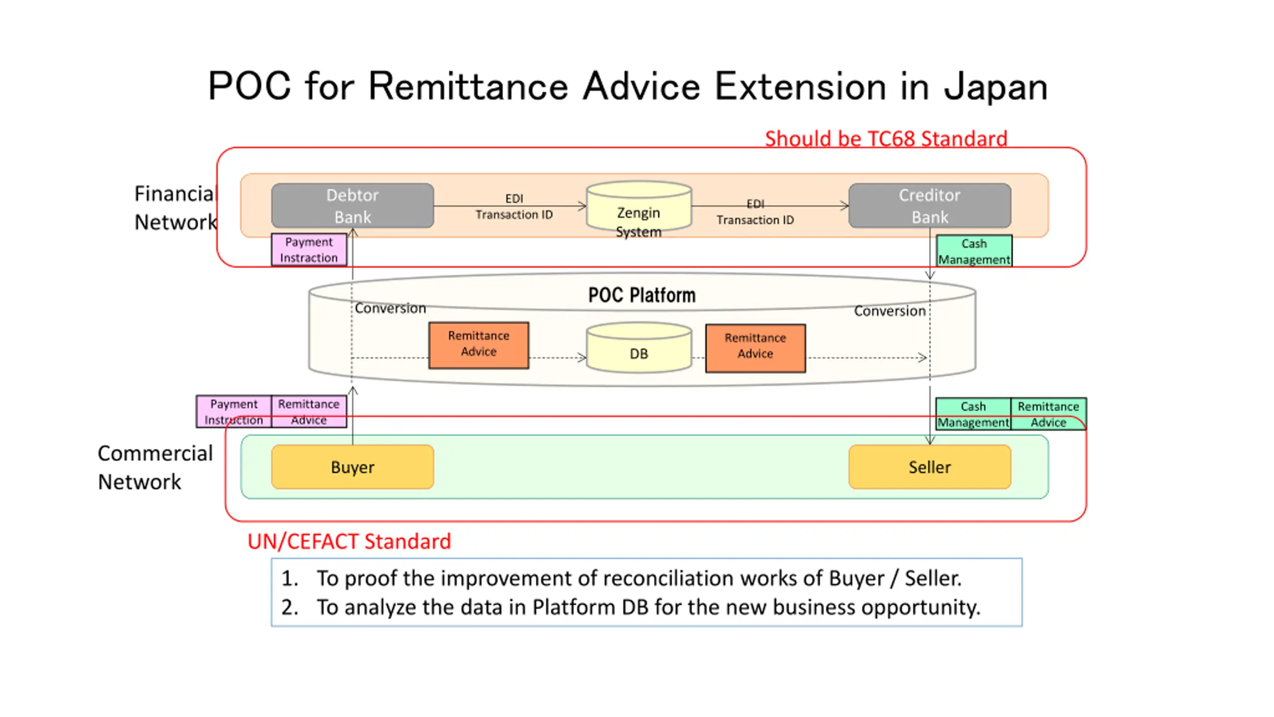 POC for Remittance Advice Extension in Japan Should be TC68 Standard Financial Network Debtor Bank Creditor Bank EDI EDI Zengin System Transaction ID Transaction ID Payment Instraction Cash Management POC Platform Conversion Conversion Remittance Advice Remittance Advice DB Payment Instruction Remittance Advice Cash Remittance Advice Management Commercial Network Buyer Seller UN/CEFACT Standard 1. To proof the improvement of reconciliation works of Buyer / Seller. 2. To analyze the data in Platform DB for the new business opportunity.