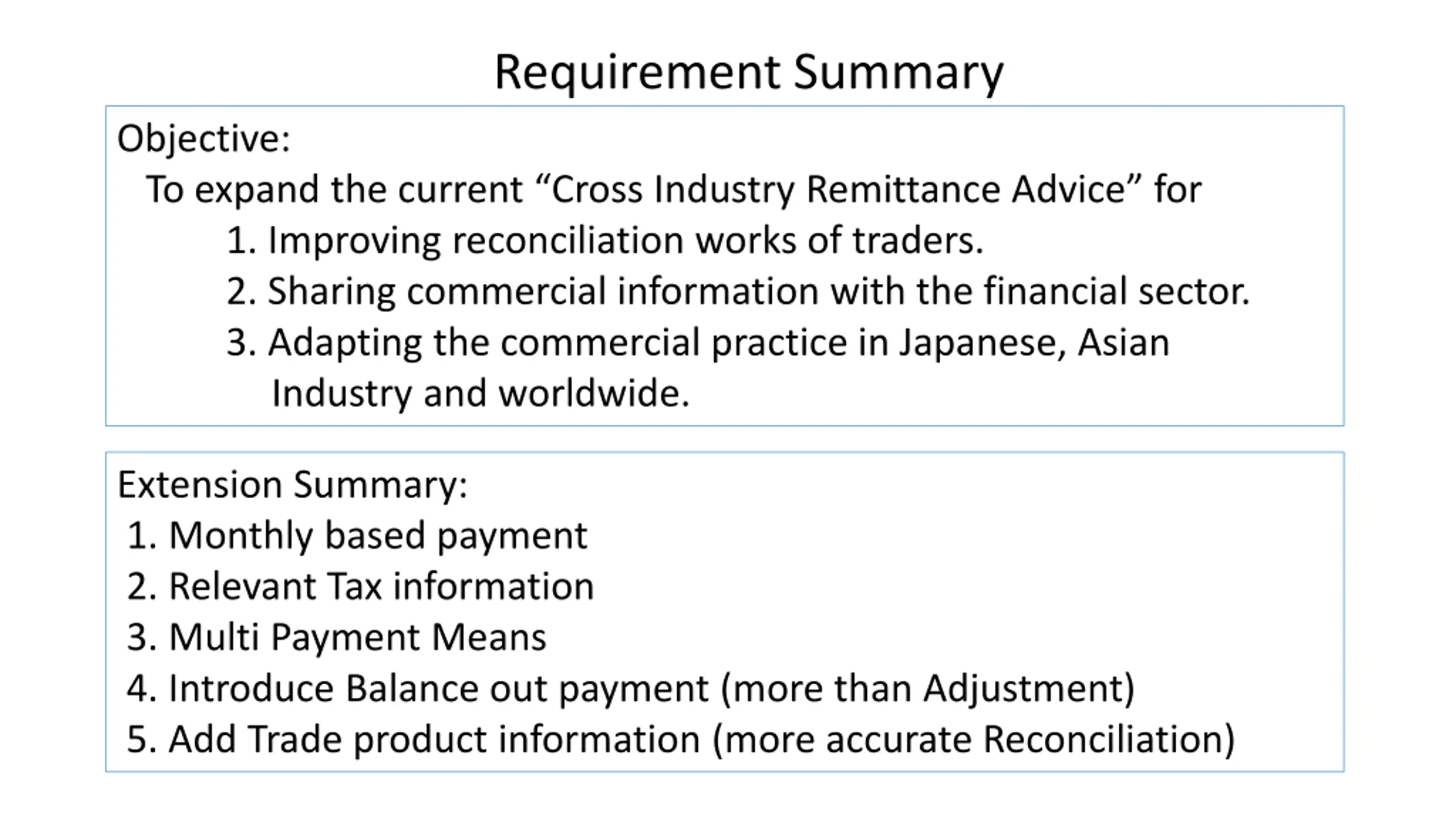 Requirement Summary Objective: To expand the current Cross Industry Remittance Advice for 1. Improving reconciliation works of traders. 2. Sharing commercial information with the financial sector. 3. Adapting the commercial practice in Japanese, Asian Industry and worldwide. Extension Summary: 1. Monthly based payment 2. Relevant Tax information 3. Multi Payment Means 4. Introduce Balance out payment (more than Adjustment) 5. Add Trade product information (more accurate Reconciliation)