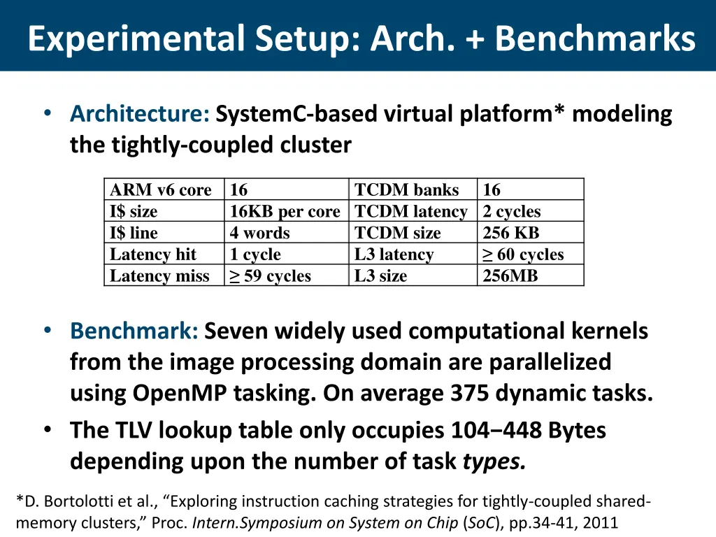 Experimental Setup: Arch. + Benchmarks Architecture: SystemC-based virtual platform* modeling the tightly-coupled cluster ARM v6 core I$ size I$ line Latency hit Latency miss 16 16KB per core TCDM latency 2 cycles 4 words TCDM size 1 cycle L3 latency 59 cycles L3 size TCDM banks 16 256 KB 60 cycles 256MB Benchmark: Seven widely used computational kernels from the image processing domain are parallelized using OpenMP tasking. On average 375 dynamic tasks. The TLV lookup table only occupies 104 448 Bytes depending upon the number of task types. *D. Bortolotti et al., Exploring instruction caching strategies for tightly-coupled shared- memory clusters, Proc. Intern.Symposium on System on Chip (SoC), pp.34-41, 2011 3-Apr-25 Andrea Marongiu / Universit di Bologna 15