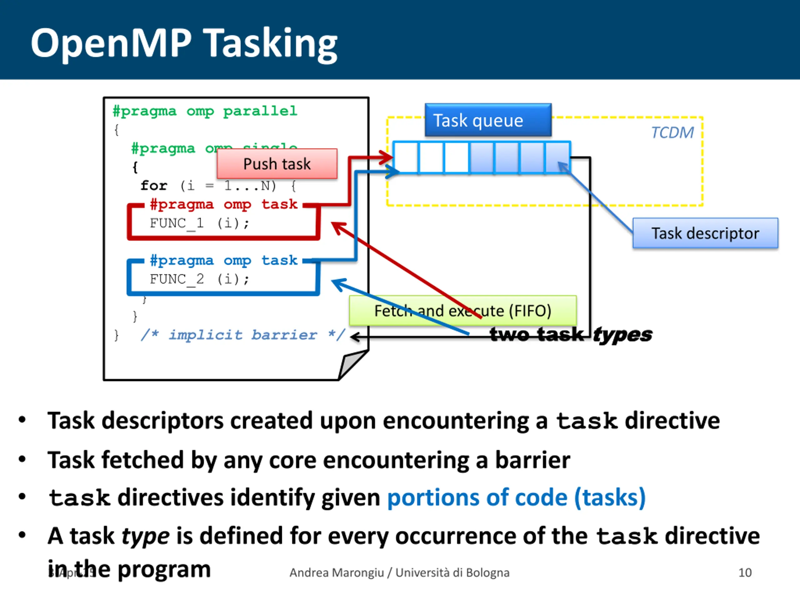 OpenMP Tasking #pragma omp parallel { #pragma omp single { for (i = 1...N) { #pragma omp task FUNC_1 (i); Task queue TCDM Push task Task descriptor #pragma omp task FUNC_2 (i); } } } /* implicit barrier */ Fetch and execute (FIFO) two task types types Task descriptors created upon encountering a task directive Task fetched by any core encountering a barrier task directives identify given portions of code (tasks) A task type is defined for every occurrence of the task directive 3-Apr-25 in the program Andrea Marongiu / Universit di Bologna 10