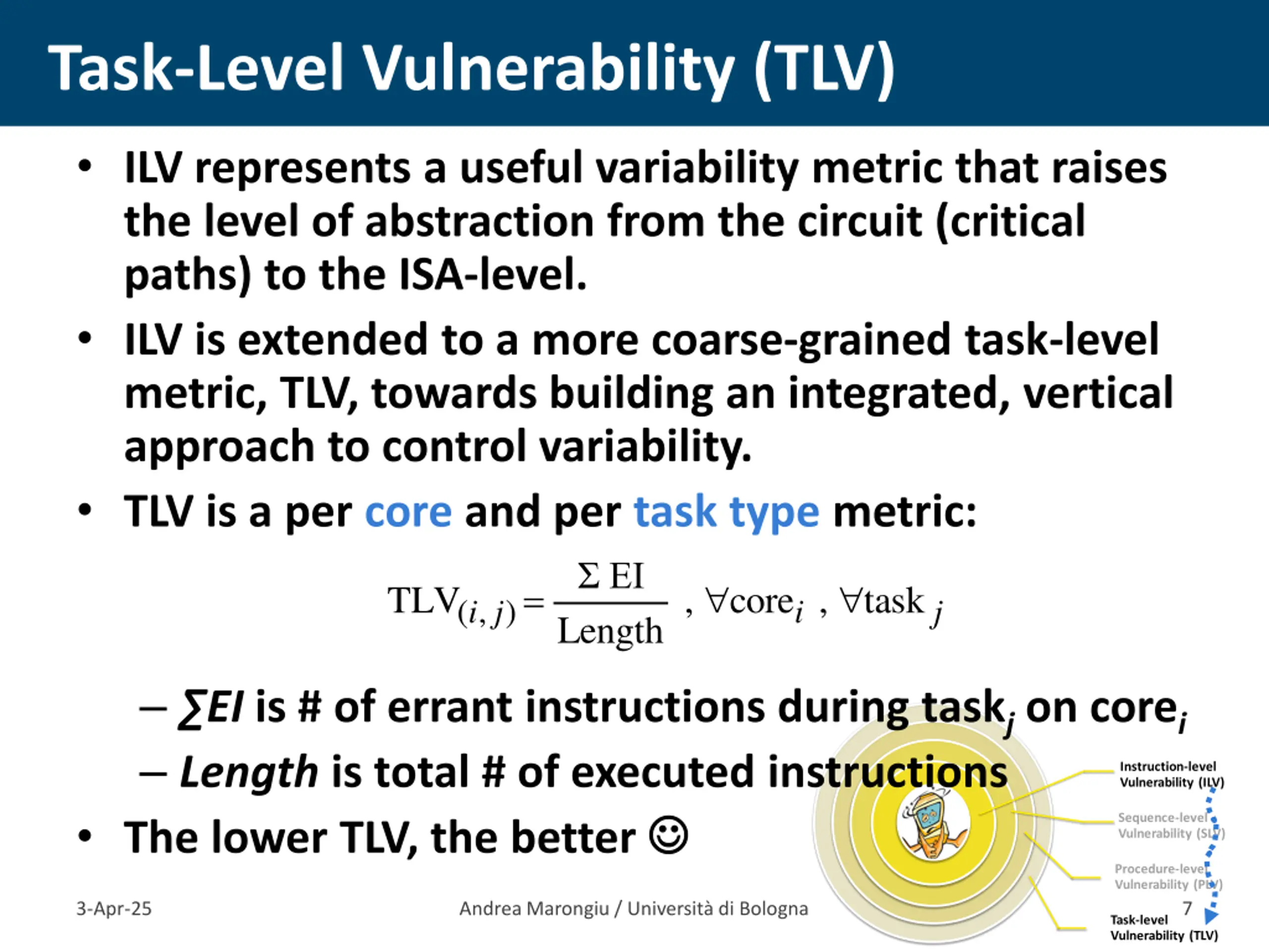 Task-Level Vulnerability (TLV) ILV represents a useful variability metric that raises the level of abstraction from the circuit (critical paths) to the ISA-level. ILV is extended to a more coarse-grained task-level metric, TLV, towards building an integrated, vertical approach to control variability. TLV is a per core and per task type metric: EI TLV Length = , core , task i ( , ) i j j EI is # of errant instructions during taskjon corei Length is total # of executed instructions The lower TLV, the better Instruction-level Vulnerability (ILV) Sequence-level Vulnerability (SLV) Procedure-level Vulnerability (PLV) 3-Apr-25 Andrea Marongiu / Universit di Bologna 7 Task-level Vulnerability (TLV)