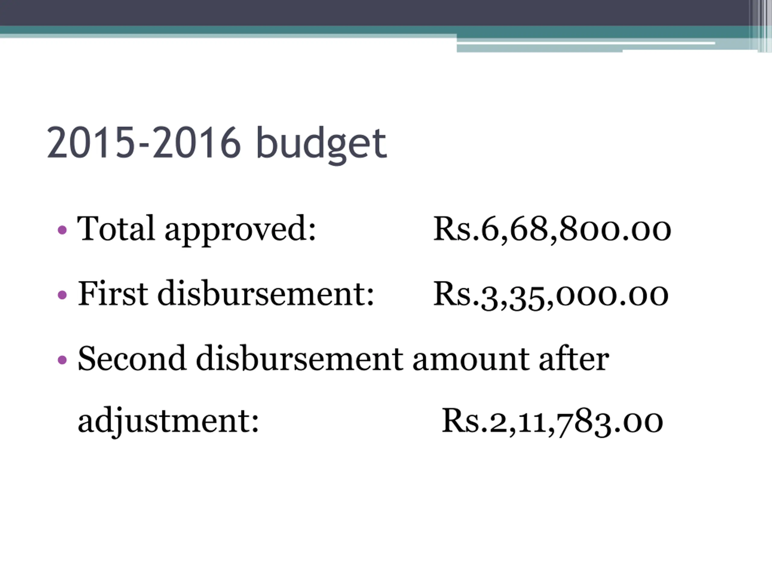 2015-2016 budget Total approved: Rs.6,68,800.00 First disbursement: Rs.3,35,000.00 Second disbursement amount after adjustment: Rs.2,11,783.00