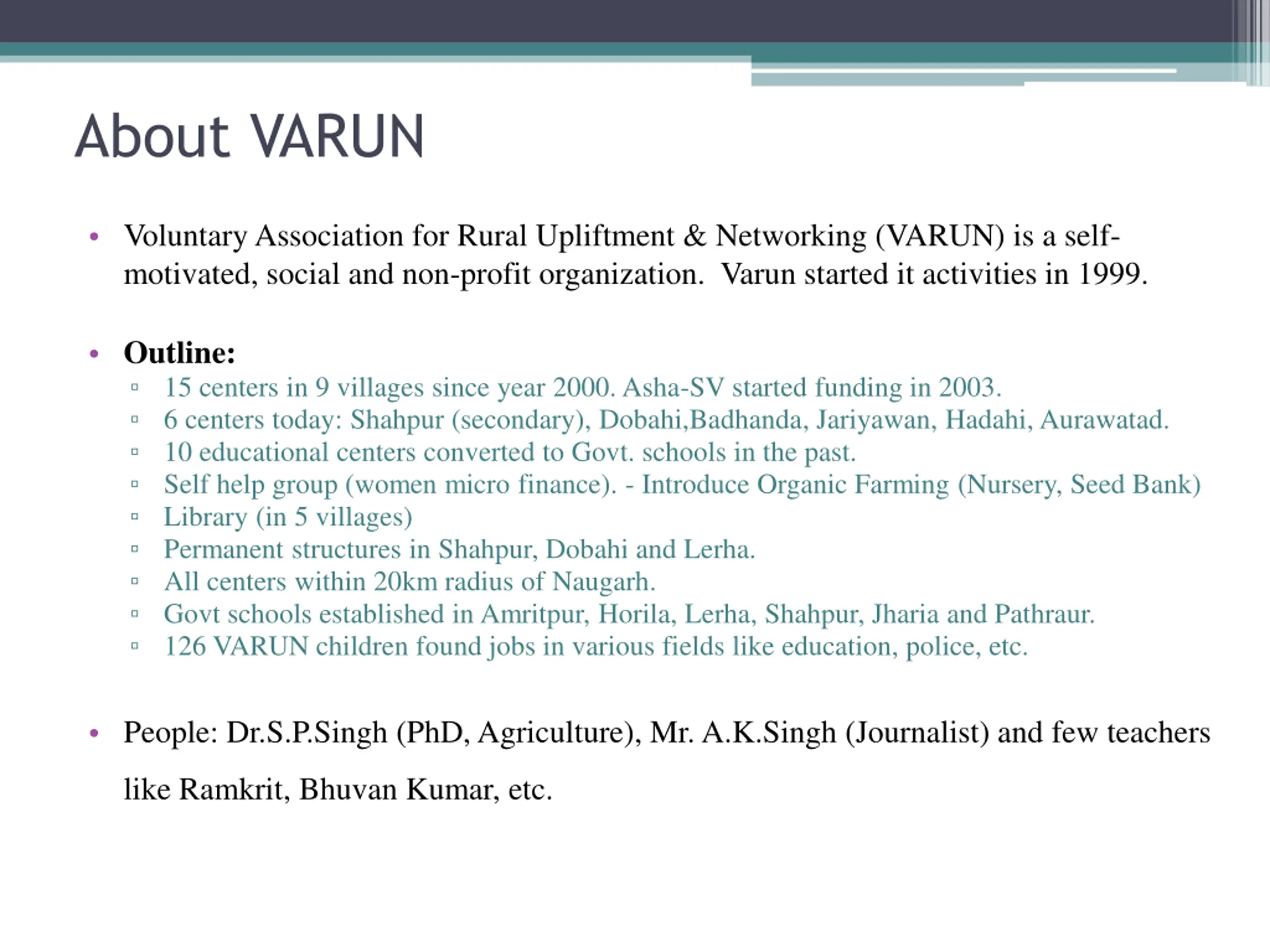 About VARUN Voluntary Association for Rural Upliftment & Networking (VARUN) is a self- motivated, social and non-profit organization. Varun started it activities in 1999. Outline: 15 centers in 9 villages since year 2000. Asha-SV started funding in 2003. 6 centers today: Shahpur (secondary), Dobahi,Badhanda, Jariyawan, Hadahi, Aurawatad. 10 educational centers converted to Govt. schools in the past. Self help group (women micro finance). - Introduce Organic Farming (Nursery, Seed Bank) Library (in 5 villages) Permanent structures in Shahpur, Dobahi and Lerha. All centers within 20km radius of Naugarh. Govt schools established in Amritpur, Horila, Lerha, Shahpur, Jharia and Pathraur. 126 VARUN children found jobs in various fields like education, police, etc. People: Dr.S.P.Singh (PhD, Agriculture), Mr. A.K.Singh (Journalist) and few teachers like Ramkrit, Bhuvan Kumar, etc.