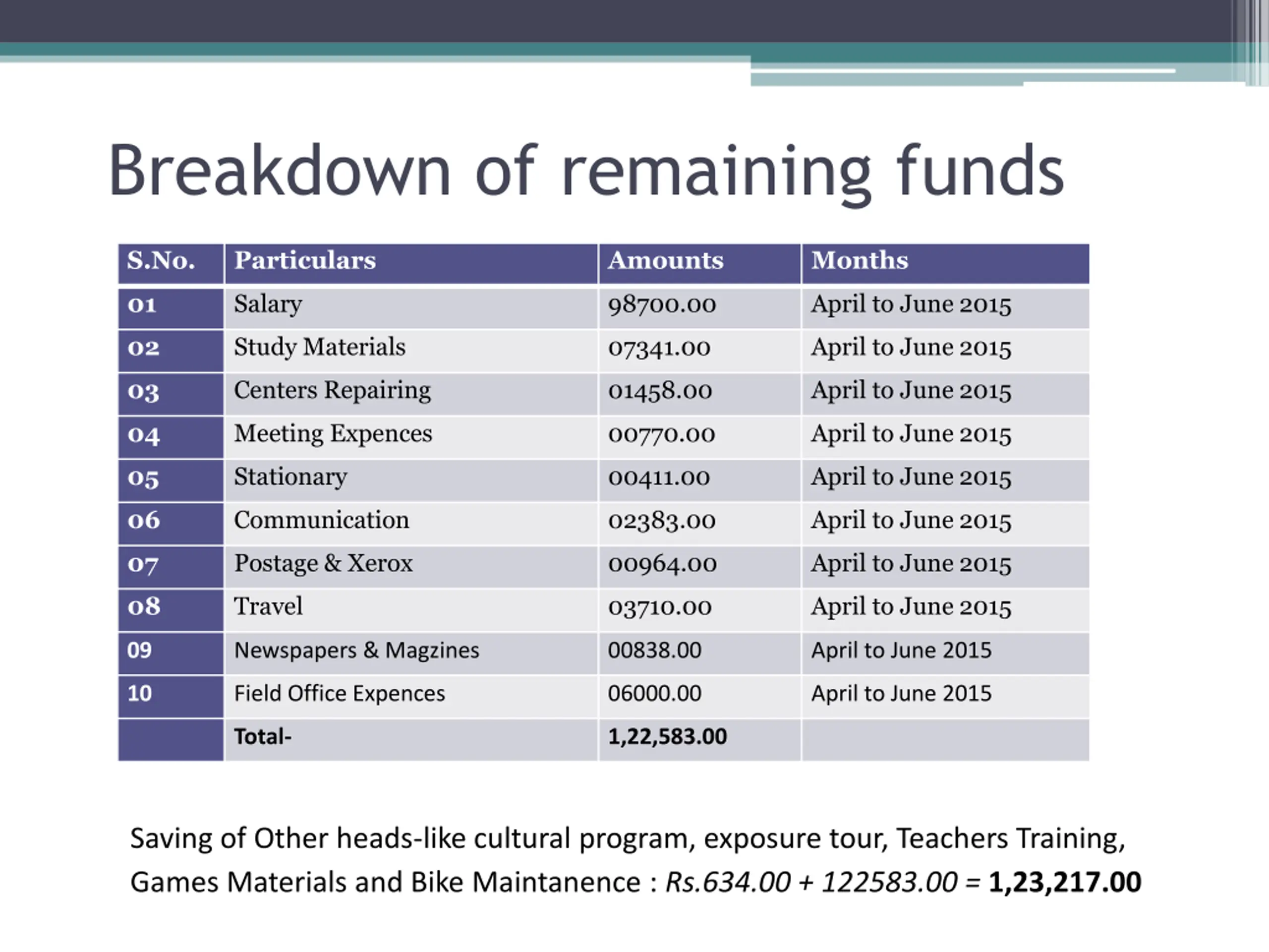 Breakdown of remaining funds S.No. Particulars Amounts Months 01 Salary 98700.00 April to June 2015 02 Study Materials 07341.00 April to June 2015 03 Centers Repairing 01458.00 April to June 2015 04 Meeting Expences 00770.00 April to June 2015 05 Stationary 00411.00 April to June 2015 06 Communication 02383.00 April to June 2015 07 Postage & Xerox 00964.00 April to June 2015 08 Travel 03710.00 April to June 2015 09 Newspapers & Magzines 00838.00 April to June 2015 10 Field Office Expences 06000.00 April to June 2015 Total- 1,22,583.00 Saving of Other heads-like cultural program, exposure tour, Teachers Training, Games Materials and Bike Maintanence : Rs.634.00 + 122583.00 =1,23,217.00