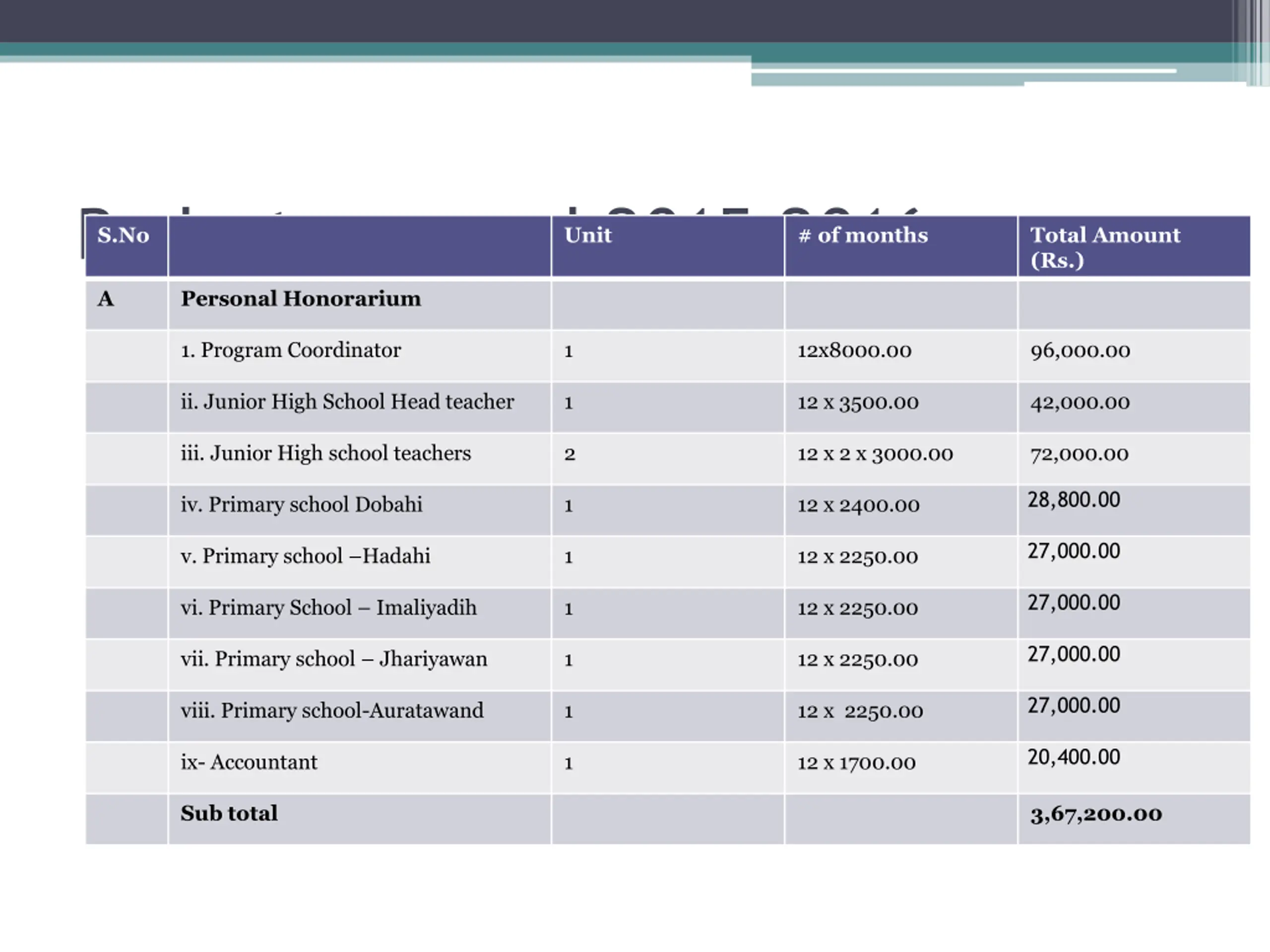 Budget proposal 2015-2016 S.No Unit # of months Total Amount (Rs.) A Personal Honorarium 1. Program Coordinator 1 12x8000.00 96,000.00 ii. Junior High School Head teacher 1 12 x 3500.00 42,000.00 iii. Junior High school teachers 2 12 x 2 x 3000.00 72,000.00 28,800.00 iv. Primary school Dobahi 1 12 x 2400.00 27,000.00 v. Primary school Hadahi 1 12 x 2250.00 27,000.00 vi. Primary School Imaliyadih 1 12 x 2250.00 27,000.00 vii. Primary school Jhariyawan 1 12 x 2250.00 27,000.00 viii. Primary school-Auratawand 1 12 x 2250.00 20,400.00 ix- Accountant 1 12 x 1700.00 Sub total 3,67,200.00