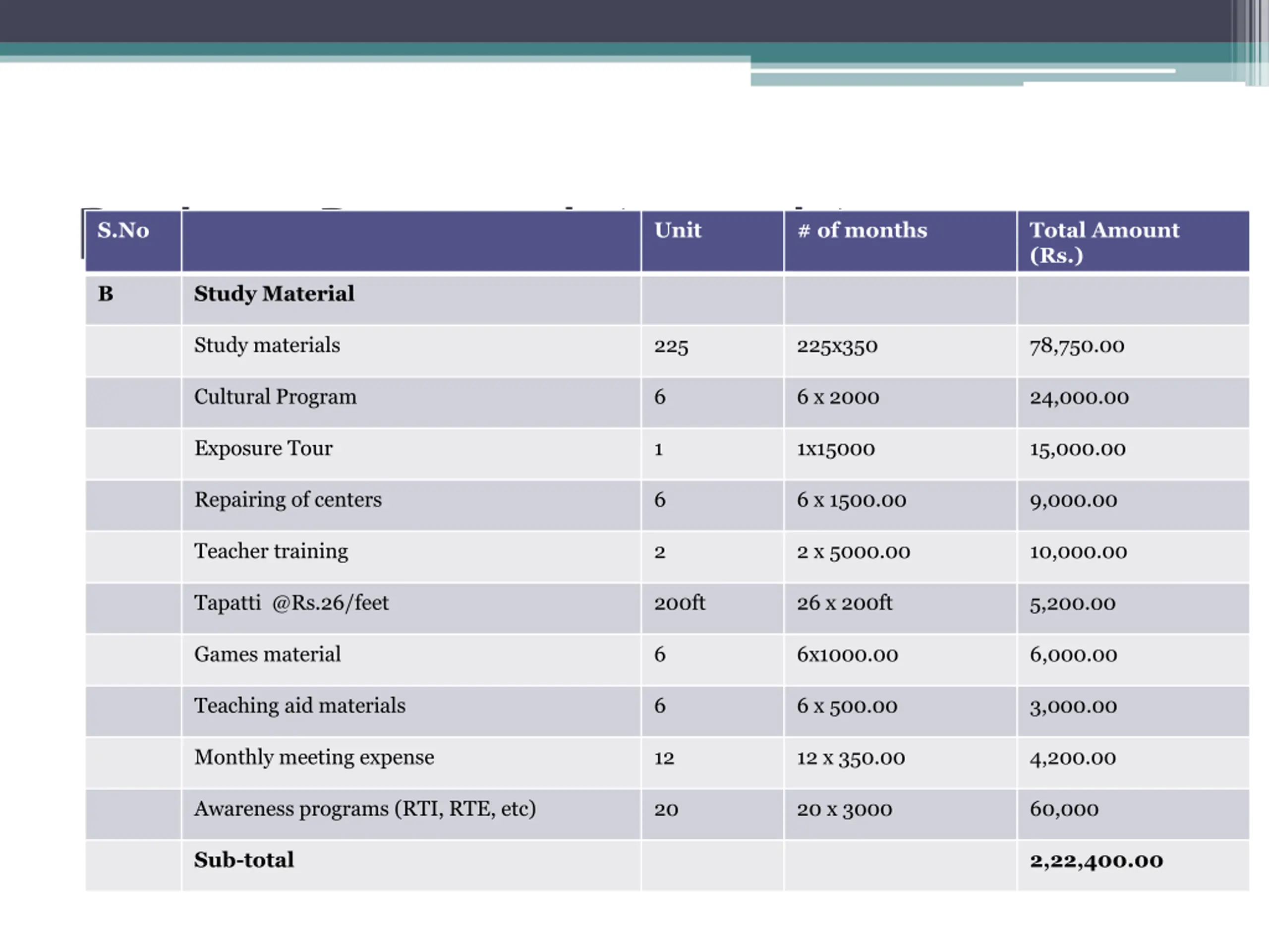 Budget Proposal (contd.) B Study Material S.No Unit # of months Total Amount (Rs.) Study materials 225 225x350 78,750.00 Cultural Program 6 6 x 2000 24,000.00 Exposure Tour 1 1x15000 15,000.00 Repairing of centers 6 6 x 1500.00 9,000.00 Teacher training 2 2 x 5000.00 10,000.00 Tapatti @Rs.26/feet 200ft 26 x 200ft 5,200.00 Games material 6 6x1000.00 6,000.00 Teaching aid materials 6 6 x 500.00 3,000.00 Monthly meeting expense 12 12 x 350.00 4,200.00 Awareness programs (RTI, RTE, etc) 20 20 x 3000 60,000 Sub-total 2,22,400.00