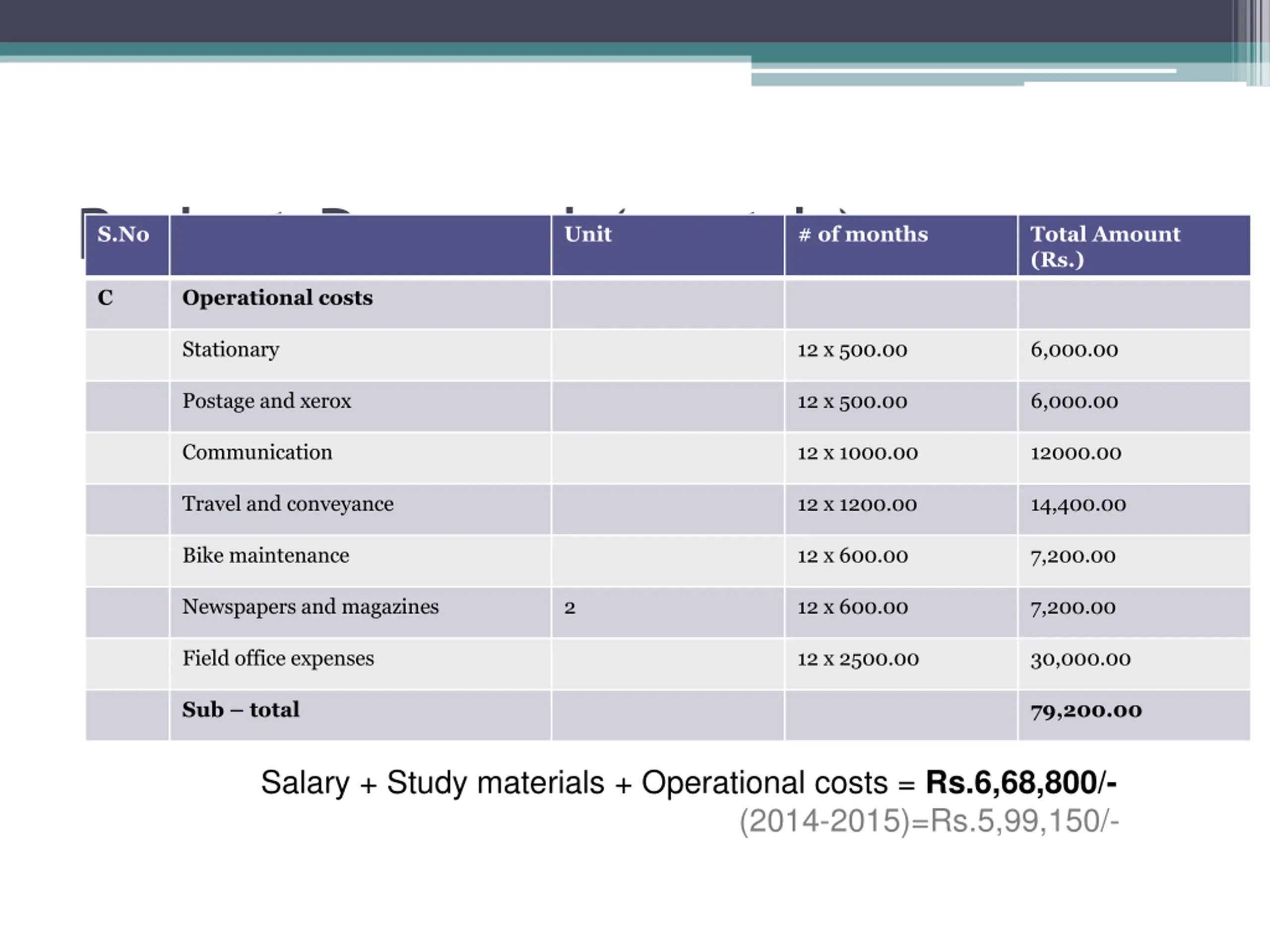 Budget Proposal (contd.) S.No Unit # of months Total Amount (Rs.) C Operational costs Stationary 12 x 500.00 6,000.00 Postage and xerox 12 x 500.00 6,000.00 Communication 12 x 1000.00 12000.00 Travel and conveyance 12 x 1200.00 14,400.00 Bike maintenance 12 x 600.00 7,200.00 Newspapers and magazines 2 12 x 600.00 7,200.00 Field office expenses 12 x 2500.00 30,000.00 Sub total 79,200.00 Salary + Study materials + Operational costs = Rs.6,68,800/- (2014-2015)=Rs.5,99,150/-