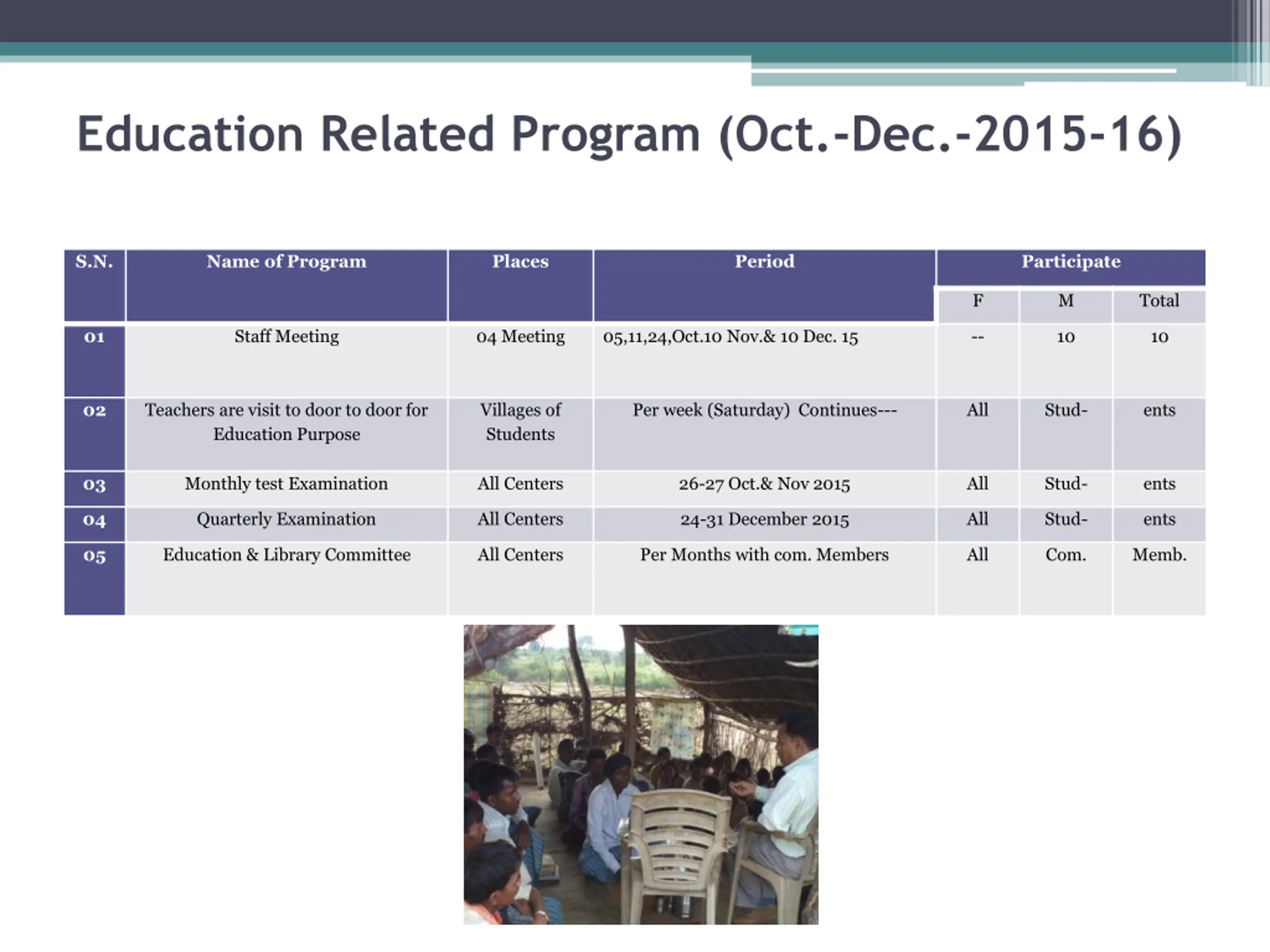 Education Related Program (Oct.-Dec.-2015-16) S.N. Name of Program Places Period Participate F M Total 01 Staff Meeting 04 Meeting 05,11,24,Oct.10 Nov.& 10 Dec. 15 -- 10 10 02 Teachers are visit to door to door for Education Purpose Villages of Students Per week (Saturday) Continues--- All Stud- ents 03 Monthly test Examination All Centers 26-27 Oct.& Nov 2015 All Stud- ents 04 Quarterly Examination All Centers 24-31 December 2015 All Stud- ents 05 Education & Library Committee All Centers Per Months with com. Members All Com. Memb.
