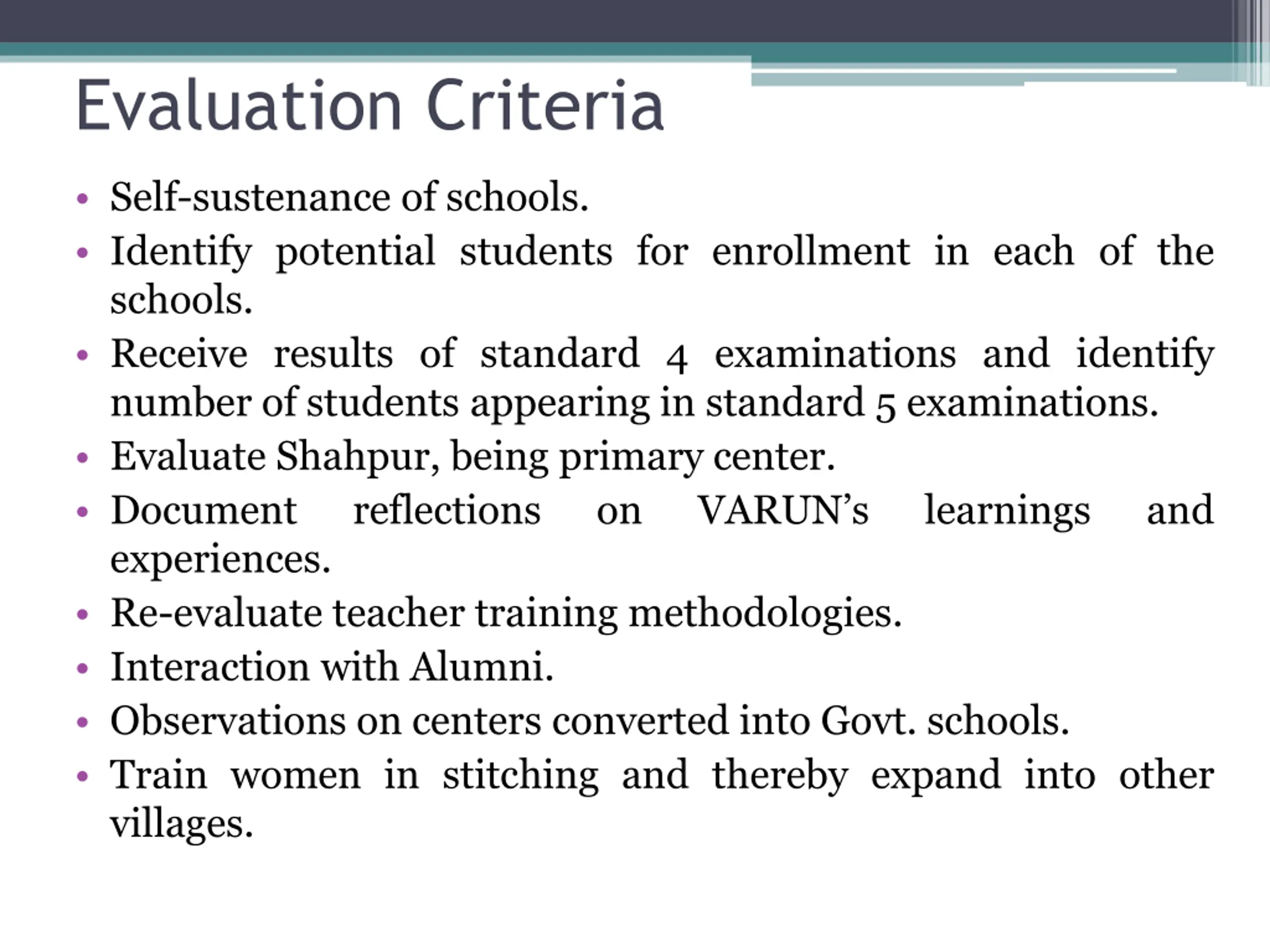 Evaluation Criteria Self-sustenance of schools. Identify potential students for enrollment in each of the schools. Receive results of standard 4 examinations and identify number of students appearing in standard 5 examinations. Evaluate Shahpur, being primary center. Document reflections on experiences. Re-evaluate teacher training methodologies. Interaction with Alumni. Observations on centers converted into Govt. schools. Train women in stitching and thereby expand into other villages. VARUN s learnings and