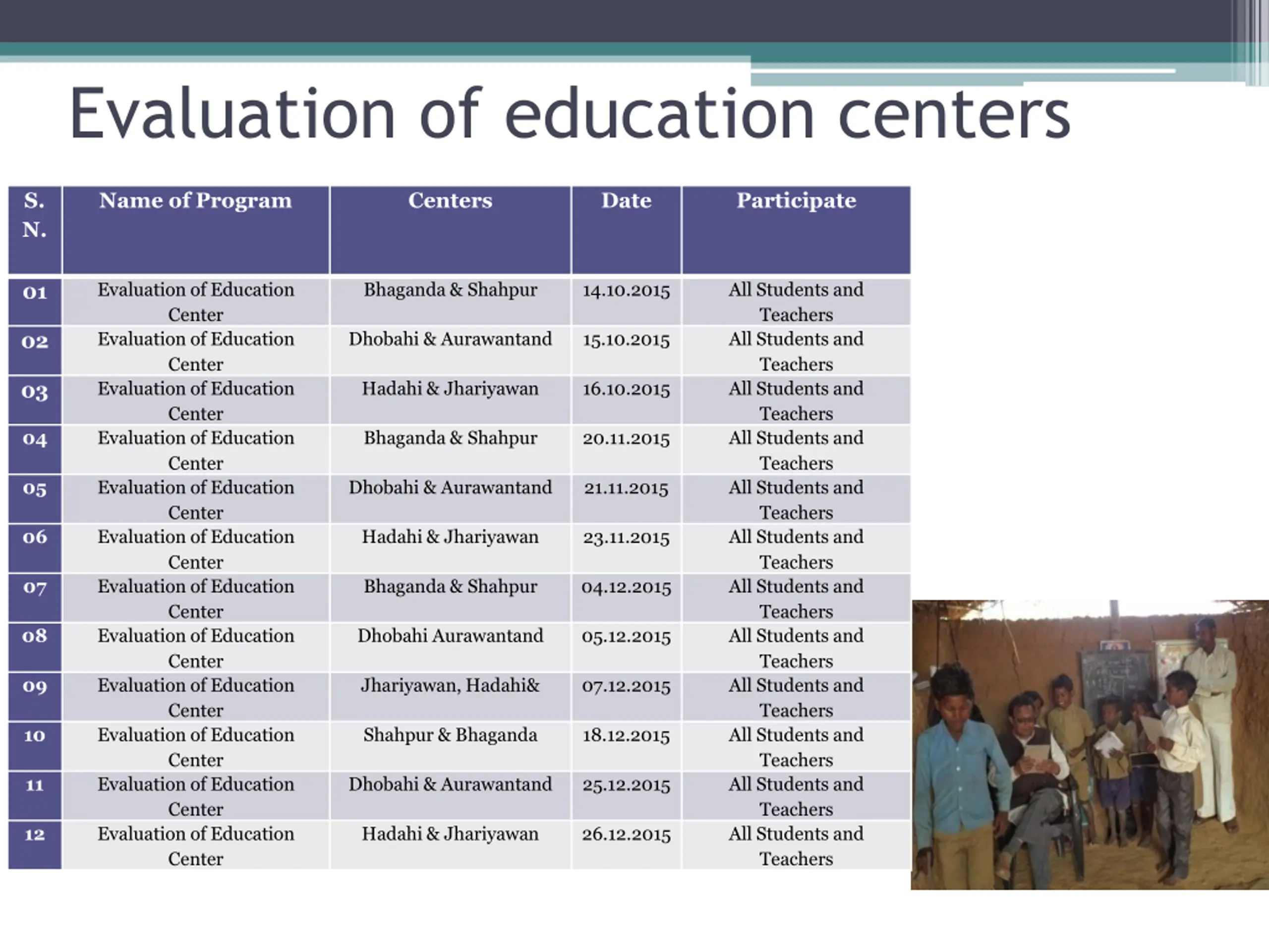 Evaluation of education centers S. N. Name of Program Centers Date Participate Evaluation of Education Center Evaluation of Education Center Evaluation of Education Center Evaluation of Education Center Evaluation of Education Center Evaluation of Education Center Evaluation of Education Center Evaluation of Education Center Evaluation of Education Center Evaluation of Education Center Evaluation of Education Center Evaluation of Education Center Bhaganda & Shahpur 14.10.2015 All Students and Teachers All Students and Teachers All Students and Teachers All Students and Teachers All Students and Teachers All Students and Teachers All Students and Teachers All Students and Teachers All Students and Teachers All Students and Teachers All Students and Teachers All Students and Teachers 01 Dhobahi & Aurawantand 15.10.2015 02 Hadahi & Jhariyawan 16.10.2015 03 04 Bhaganda & Shahpur 20.11.2015 05 Dhobahi & Aurawantand 21.11.2015 06 Hadahi & Jhariyawan 23.11.2015 07 Bhaganda & Shahpur 04.12.2015 08 Dhobahi Aurawantand 05.12.2015 09 Jhariyawan, Hadahi& 07.12.2015 10 Shahpur & Bhaganda 18.12.2015 11 Dhobahi & Aurawantand 25.12.2015 12 Hadahi & Jhariyawan 26.12.2015