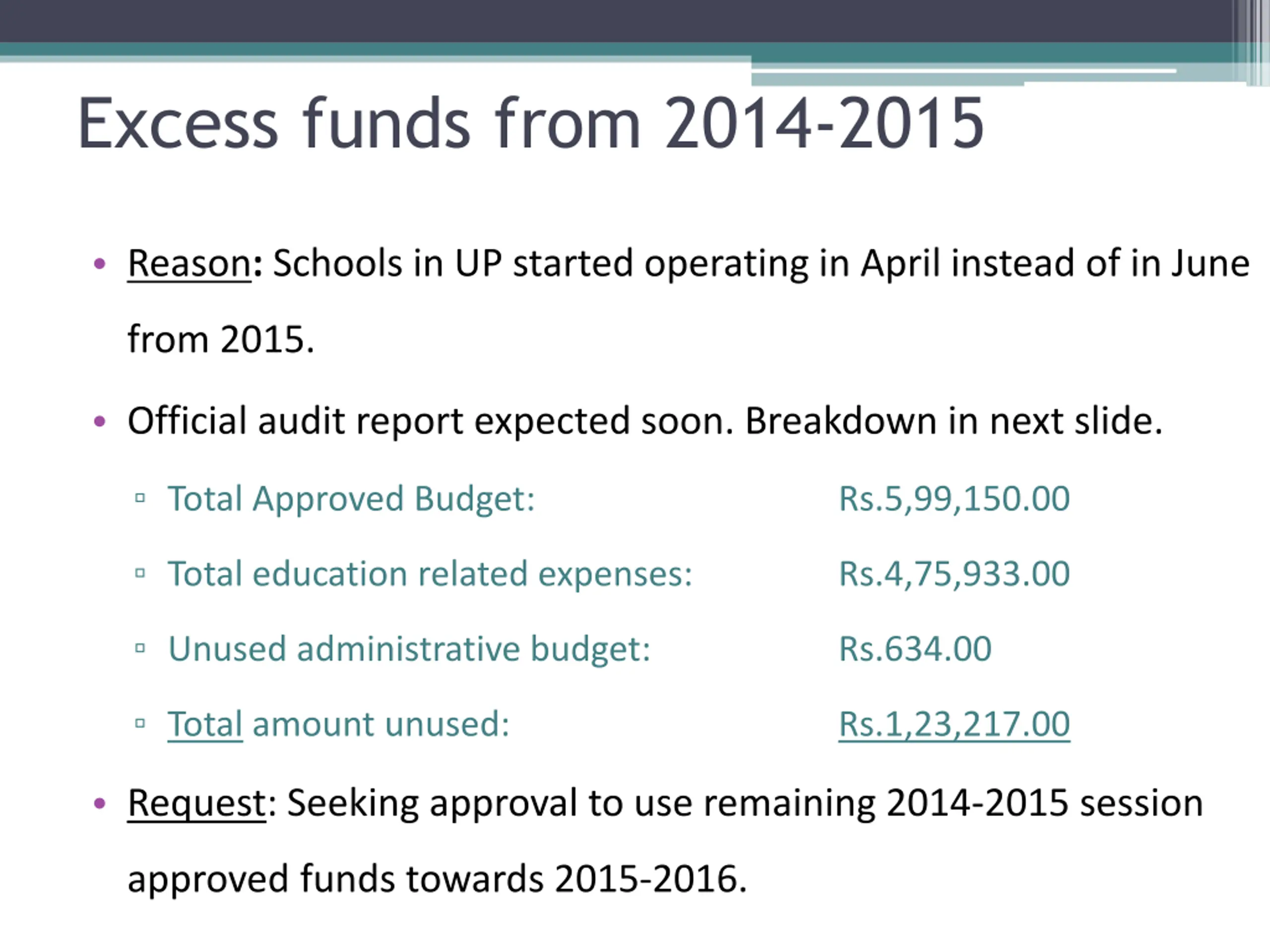 Excess funds from 2014-2015 Reason: Schools in UP started operating in April instead of in June from 2015. Official audit report expected soon. Breakdown in next slide. Total Approved Budget: Rs.5,99,150.00 Total education related expenses: Rs.4,75,933.00 Unused administrative budget: Rs.634.00 Total amount unused: Rs.1,23,217.00 Request: Seeking approval to use remaining 2014-2015 session approved funds towards 2015-2016.