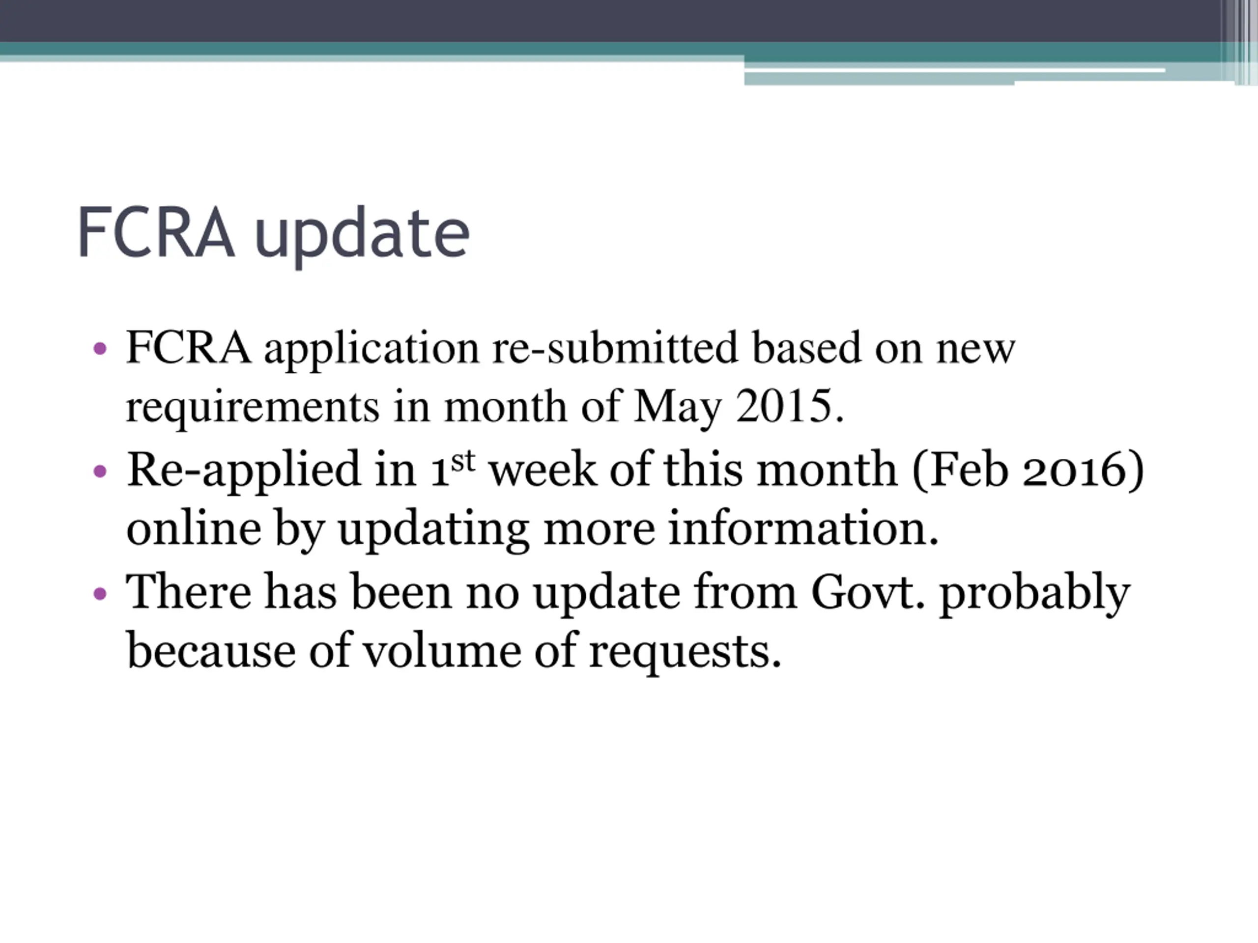 FCRA update FCRA application re-submitted based on new requirements in month of May 2015. Re-applied in 1st week of this month (Feb 2016) online by updating more information. There has been no update from Govt. probably because of volume of requests.