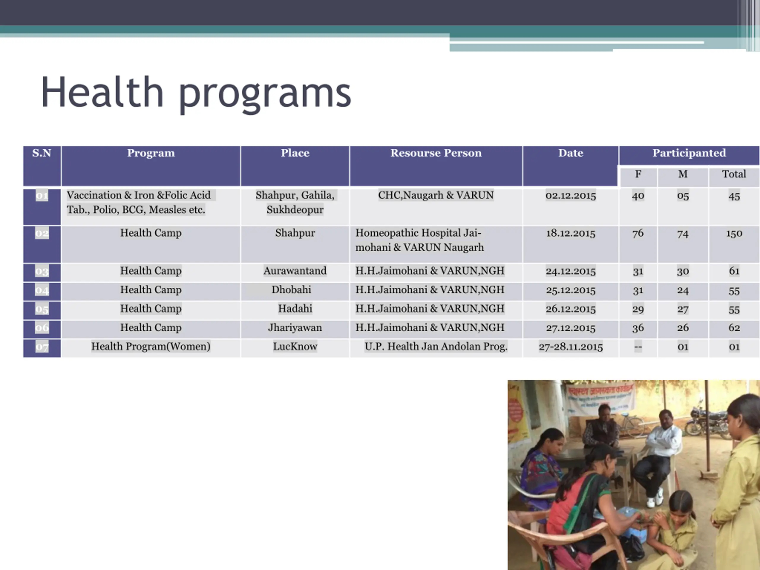 Health programs S.N Program Place Resourse Person Date Participanted F M Total 01 Vaccination & Iron &Folic Acid Tab., Polio, BCG, Measles etc. Shahpur, Gahila, Sukhdeopur CHC,Naugarh & VARUN 02.12.2015 40 05 45 02 Health Camp Shahpur Homeopathic Hospital Jai- mohani & VARUN Naugarh 18.12.2015 76 74 150 03 Health Camp Aurawantand H.H.Jaimohani & VARUN,NGH 24.12.2015 31 30 61 04 Health Camp Dhobahi H.H.Jaimohani & VARUN,NGH 25.12.2015 31 24 55 05 Health Camp Hadahi H.H.Jaimohani & VARUN,NGH 26.12.2015 29 27 55 06 Health Camp Jhariyawan H.H.Jaimohani & VARUN,NGH 27.12.2015 36 26 62 07 Health Program(Women) LucKnow U.P. Health Jan Andolan Prog. 27-28.11.2015 -- 01 01