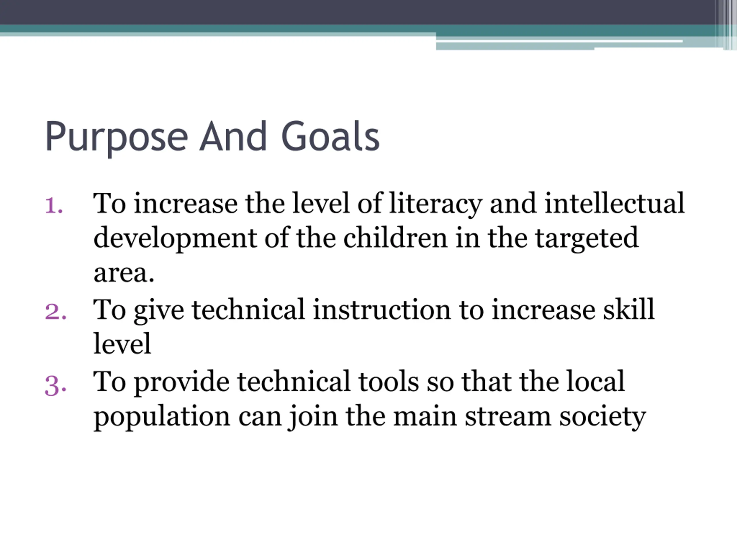 Purpose And Goals 1. To increase the level of literacy and intellectual development of the children in the targeted area. 2. To give technical instruction to increase skill level 3. To provide technical tools so that the local population can join the main stream society