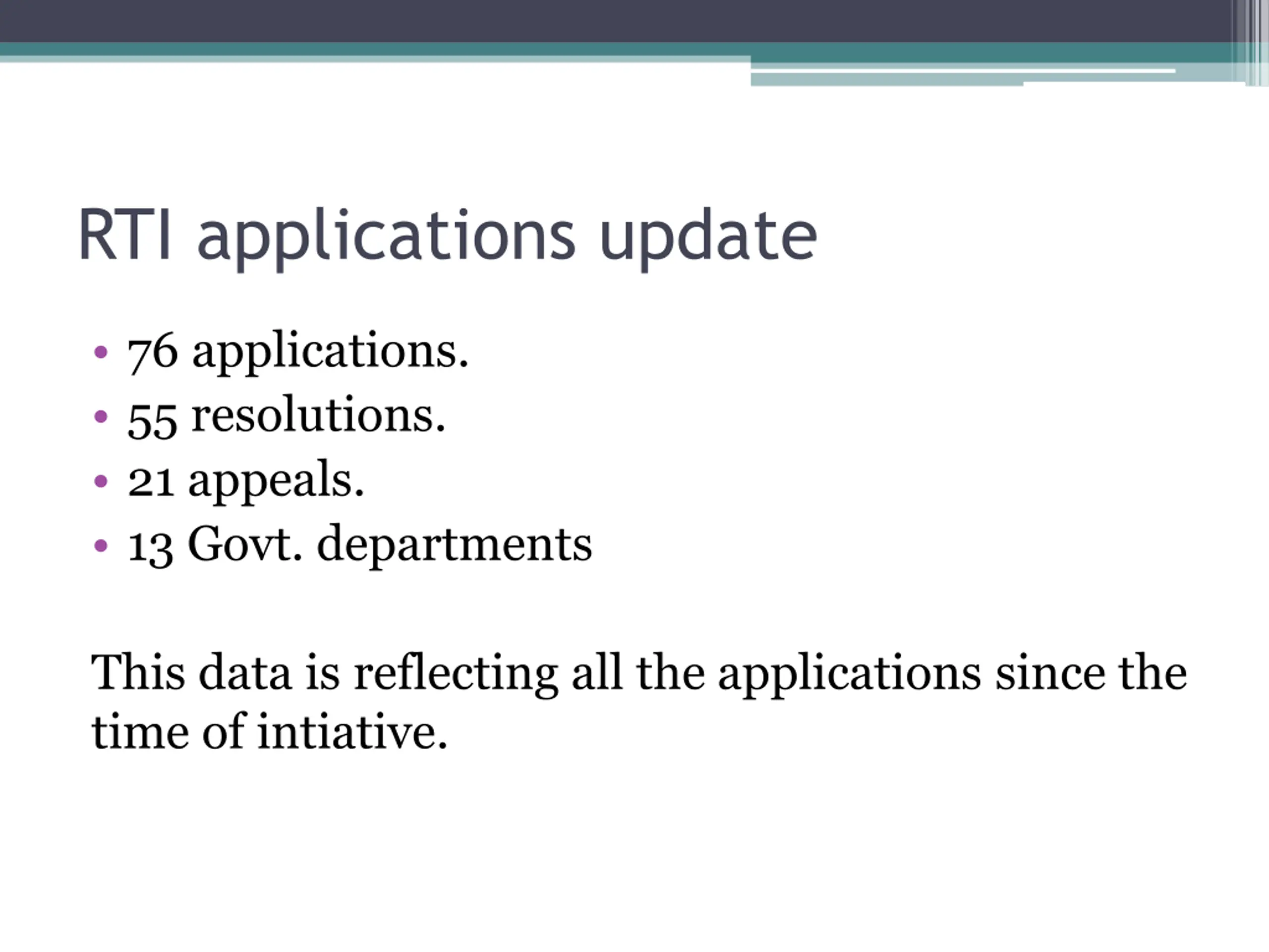 RTI applications update 76 applications. 55 resolutions. 21 appeals. 13 Govt. departments This data is reflecting all the applications since the time of intiative.