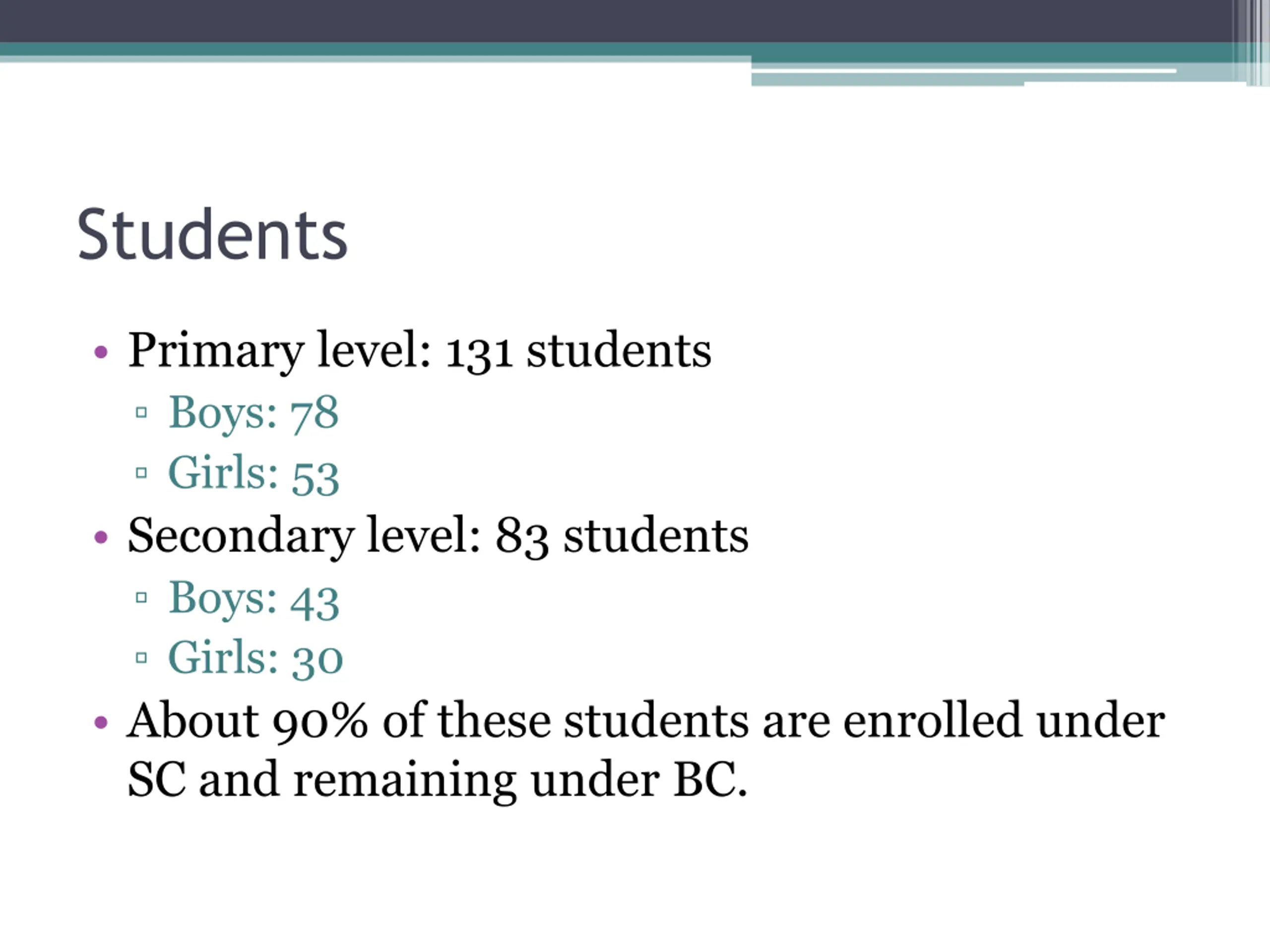 Students Primary level: 131 students Boys: 78 Girls: 53 Secondary level: 83 students Boys: 43 Girls: 30 About 90% of these students are enrolled under SC and remaining under BC.