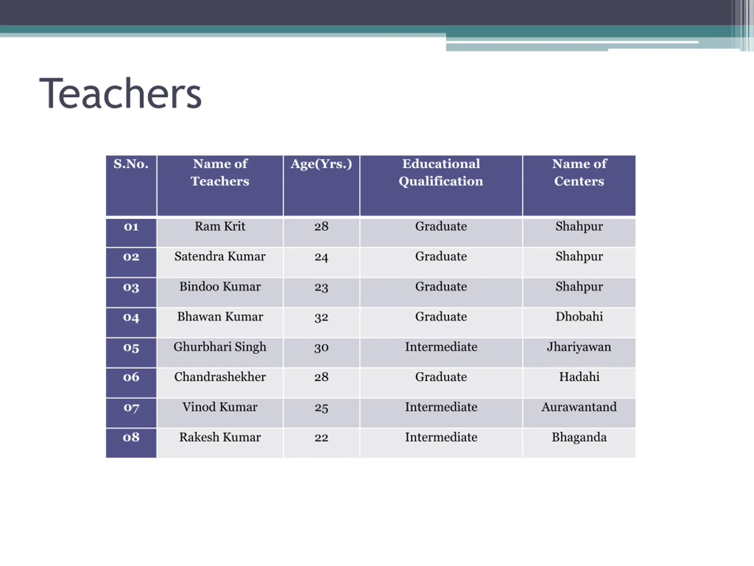 Teachers S.No. Name of Teachers Age(Yrs.) Educational Qualification Name of Centers 01 Ram Krit 28 Graduate Shahpur 02 Satendra Kumar 24 Graduate Shahpur 03 Bindoo Kumar 23 Graduate Shahpur 04 Bhawan Kumar 32 Graduate Dhobahi 05 Ghurbhari Singh 30 Intermediate Jhariyawan 06 Chandrashekher 28 Graduate Hadahi 07 Vinod Kumar 25 Intermediate Aurawantand 08 Rakesh Kumar 22 Intermediate Bhaganda