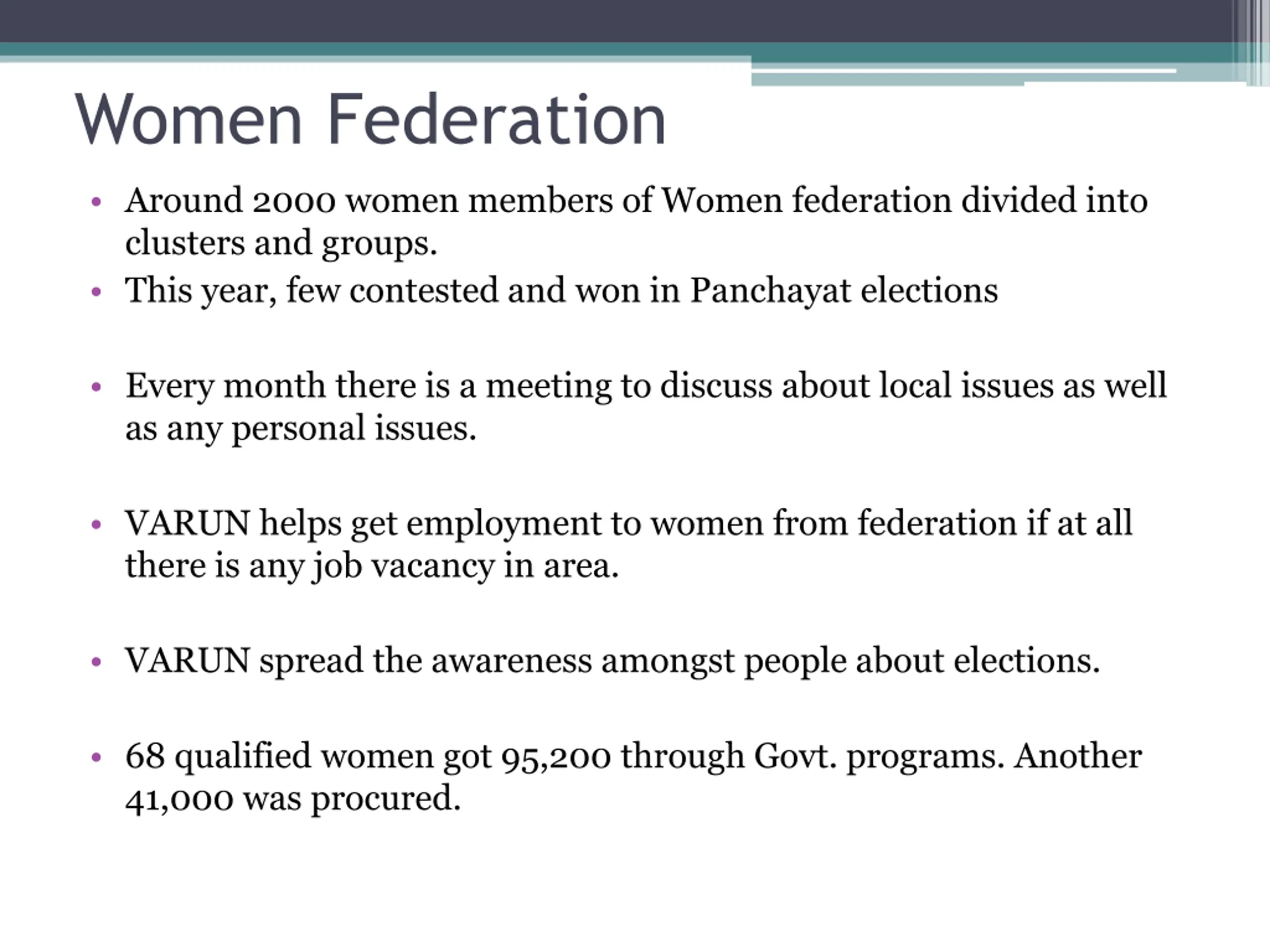 Women Federation Around 2000 women members of Women federation divided into clusters and groups. This year, few contested and won in Panchayat elections Every month there is a meeting to discuss about local issues as well as any personal issues. VARUN helps get employment to women from federation if at all there is any job vacancy in area. VARUN spread the awareness amongst people about elections. 68 qualified women got 95,200 through Govt. programs. Another 41,000 was procured.
