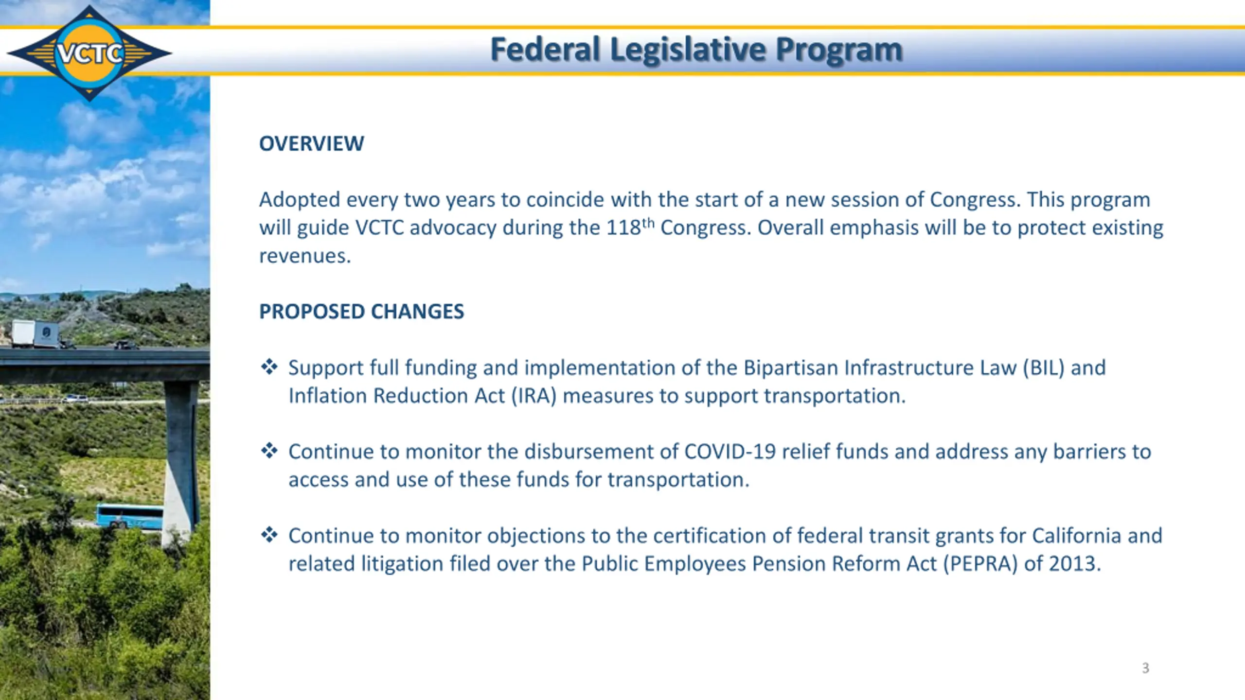 Federal Legislative Program OVERVIEW Adopted every two years to coincide with the start of a new session of Congress. This program will guide VCTC advocacy during the 118th Congress. Overall emphasis will be to protect existing revenues. PROPOSED CHANGES Support full funding and implementation of the Bipartisan Infrastructure Law (BIL) and Inflation Reduction Act (IRA) measures to support transportation. Continue to monitor the disbursement of COVID-19 relief funds and address any barriers to access and use of these funds for transportation. Continue to monitor objections to the certification of federal transit grants for California and related litigation filed over the Public Employees Pension Reform Act (PEPRA) of 2013. 3