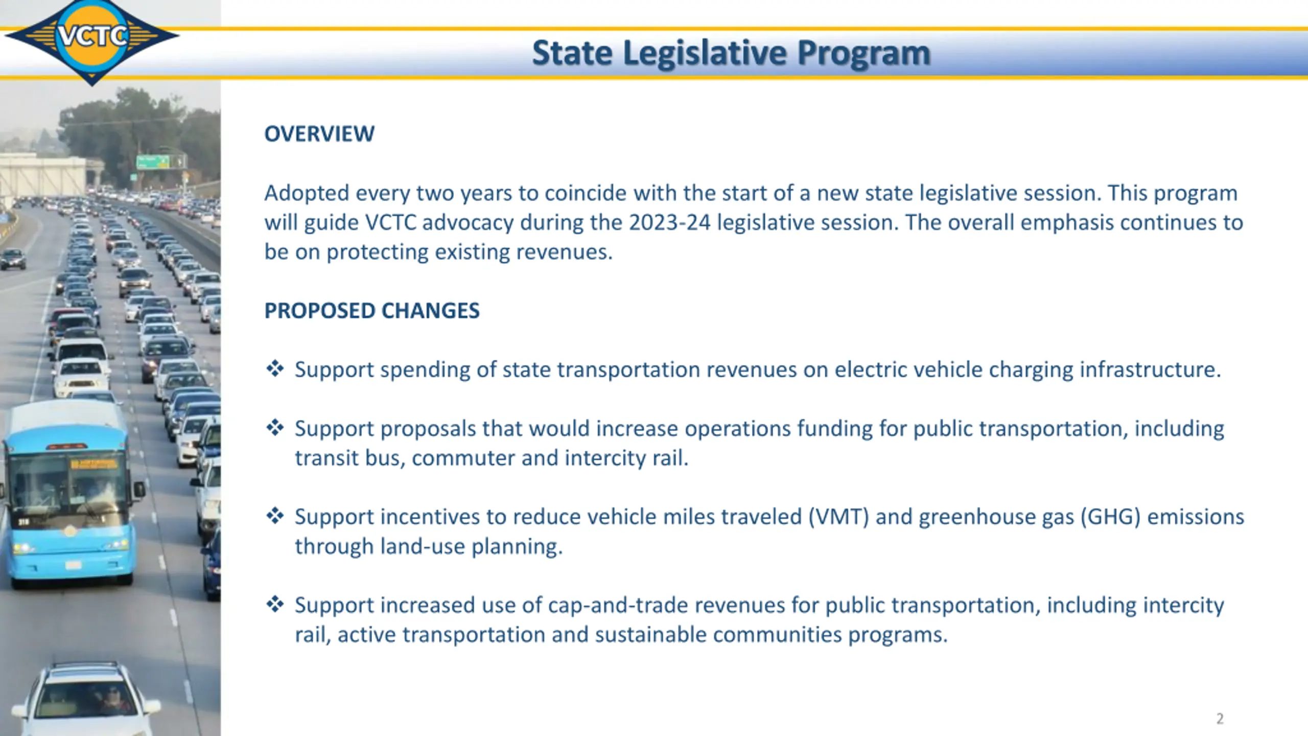 State Legislative Program OVERVIEW Adopted every two years to coincide with the start of a new state legislative session. This program will guide VCTC advocacy during the 2023-24 legislative session. The overall emphasis continues to be on protecting existing revenues. PROPOSED CHANGES Support spending of state transportation revenues on electric vehicle charging infrastructure. Support proposals that would increase operations funding for public transportation, including transit bus, commuter and intercity rail. Support incentives to reduce vehicle miles traveled (VMT) and greenhouse gas (GHG) emissions through land-use planning. Support increased use of cap-and-trade revenues for public transportation, including intercity rail, active transportation and sustainable communities programs. 2