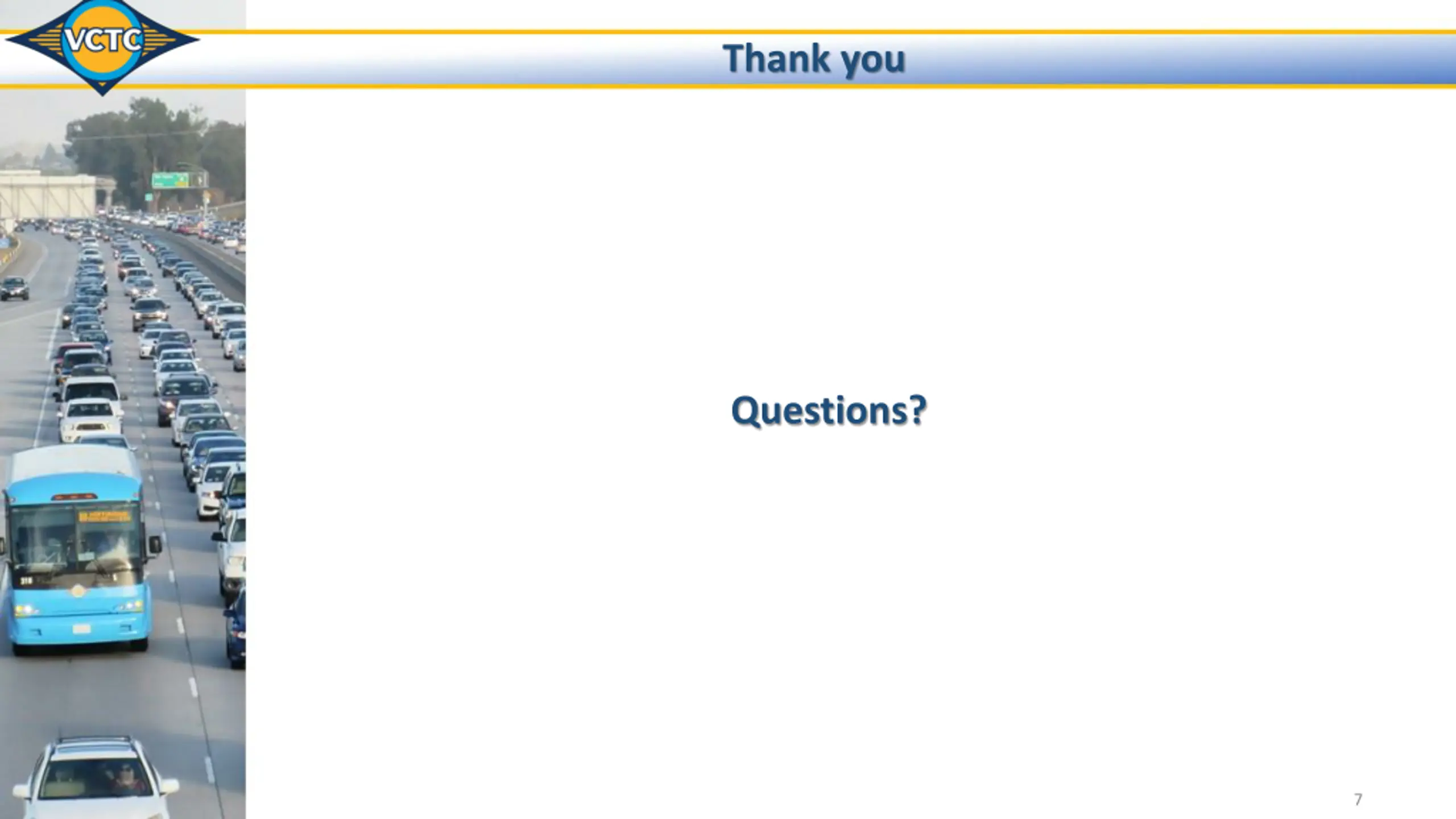 VCTC Legislative Advocacy Policy (continued) POLICY PROCEDURES VCTC Executive Director or other designee shall review requests that VCTC take a position on legislation to determine if position aligns with adopted Legislative Program. If the matter aligns with the Legislative Program, Executive Director or designee shall supply a response in the form of a letter to the legislative body reviewing the measure. All legislative position letters shall state whether VCTC is requesting support, support if amended, oppose or oppose unless amended action on the issue. A position may be adopted by the Executive Director or designee if any of the following criteria is met: The position is consistent with the Legislative Program. The position is consistent with that of organizations to which VCTC is a member. The position is approved by the Commission. Legislative positions adopted via a process outside of a regularly scheduled Commission meeting shall be communicated to the Commission at the next regularly scheduled Commission meeting. 6