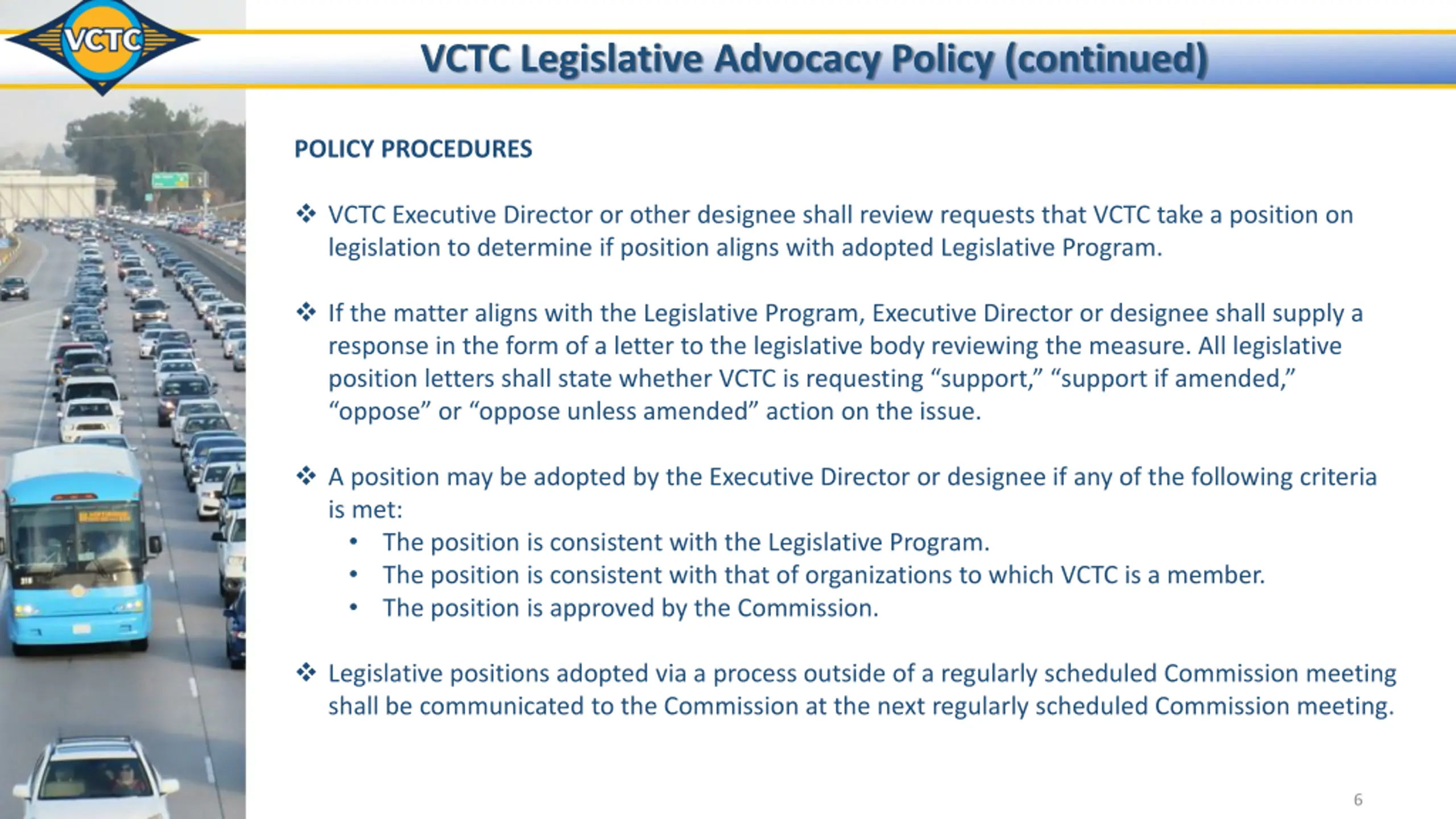 VCTC Legislative Advocacy Policy (continued) POLICY PRINCIPLES Proactively monitor and advocate for legislation as directed by the Legislative Program and by the specific direction of the Commission. Provides the VCTC Executive Director, or other designee, the flexibility to adopt positions on legislation in a timely manner. The Commission shall adopt the Legislative Program and staff is authorized to take a position without Commission approval, as long as the position fits within the adopted Legislative Program. When an applicable priority within the Legislative Program does not exist, the matter shall be brought to the Commission for formal direction at a regularly scheduled meeting. 5