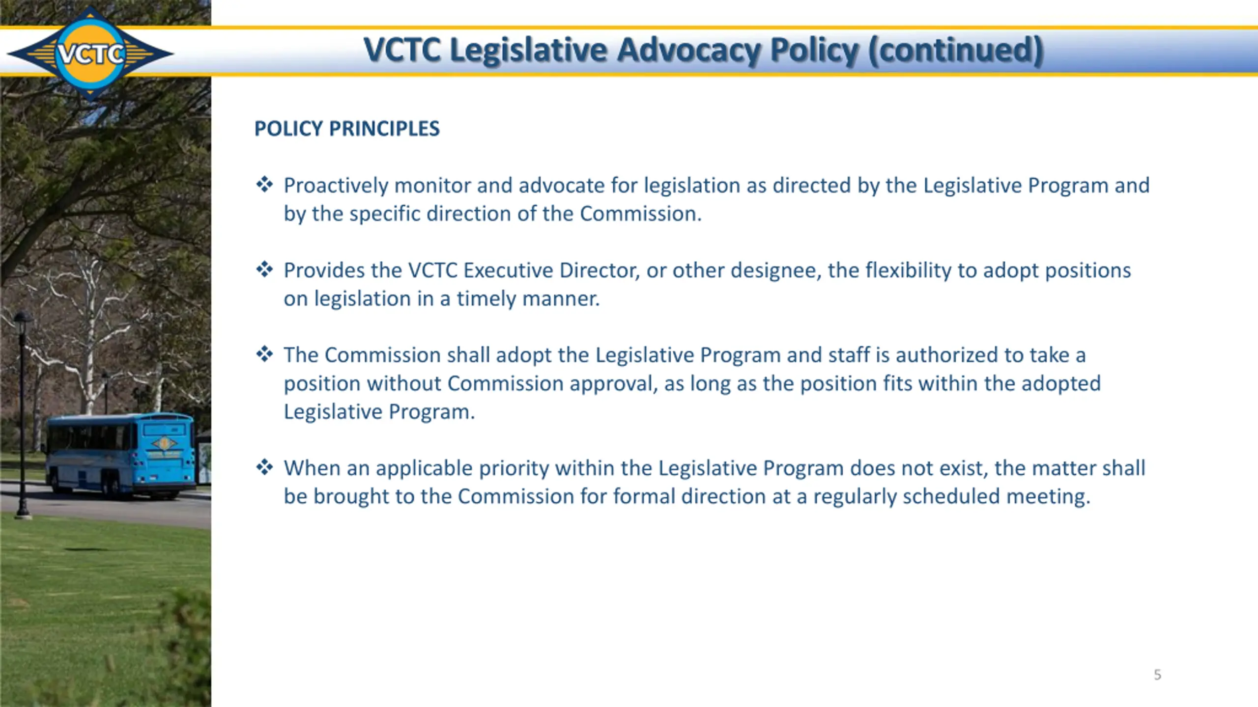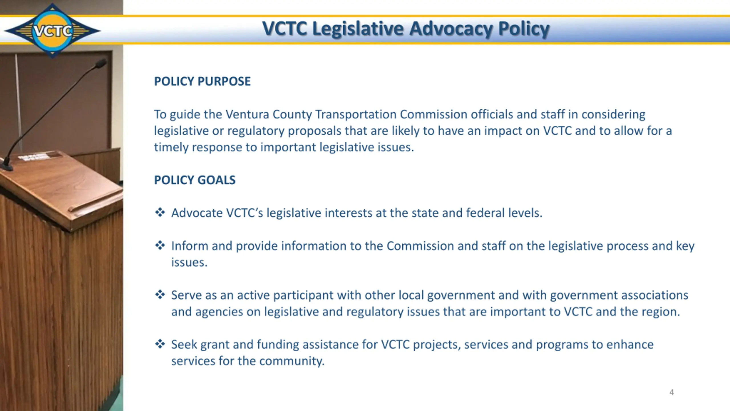 VCTC Legislative Advocacy Policy POLICY PURPOSE To guide the Ventura County Transportation Commission officials and staff in considering legislative or regulatory proposals that are likely to have an impact on VCTC and to allow for a timely response to important legislative issues. POLICY GOALS Advocate VCTC s legislative interests at the state and federal levels. Inform and provide information to the Commission and staff on the legislative process and key issues. Serve as an active participant with other local government and with government associations and agencies on legislative and regulatory issues that are important to VCTC and the region. Seek grant and funding assistance for VCTC projects, services and programs to enhance services for the community. 4