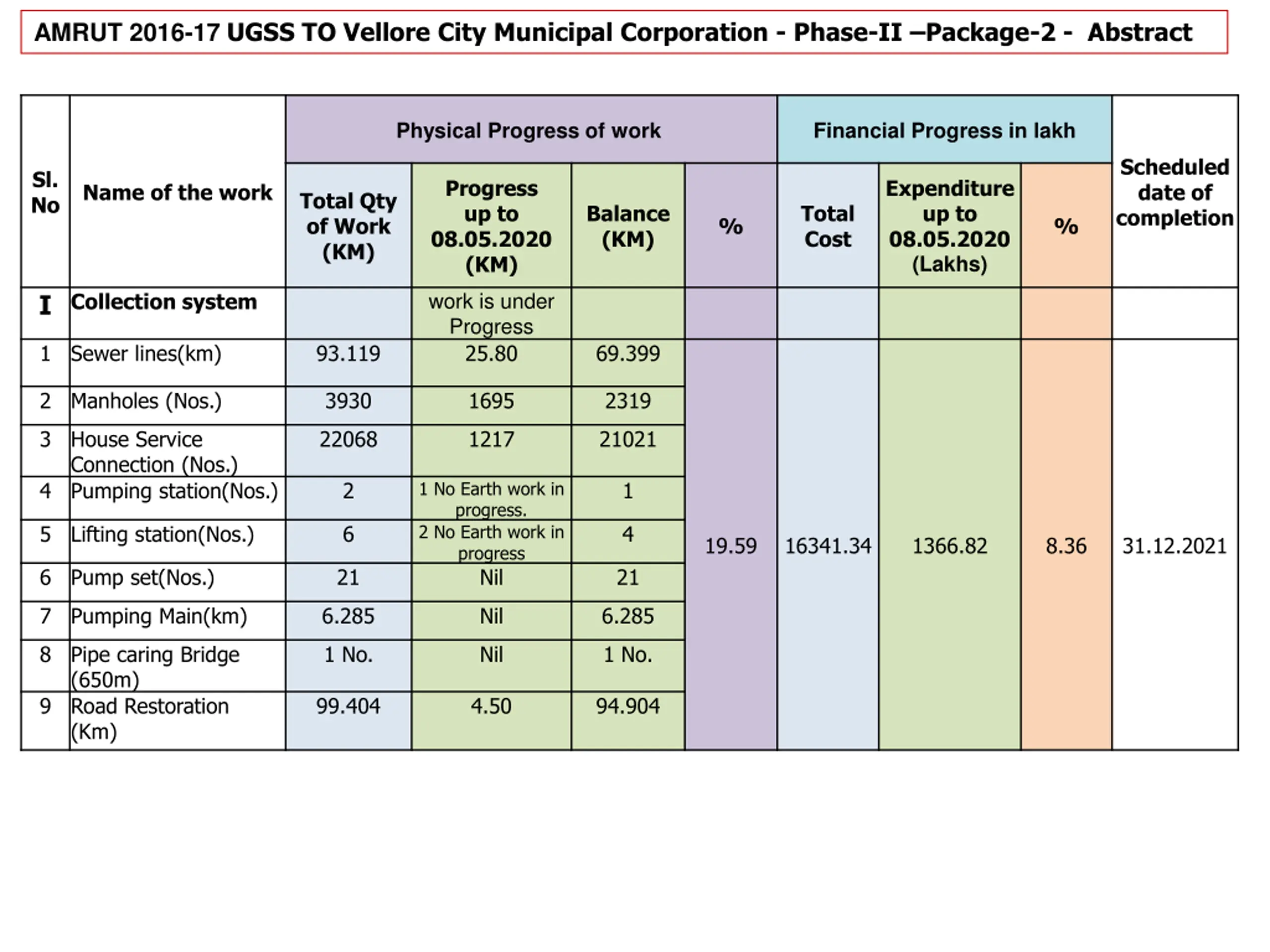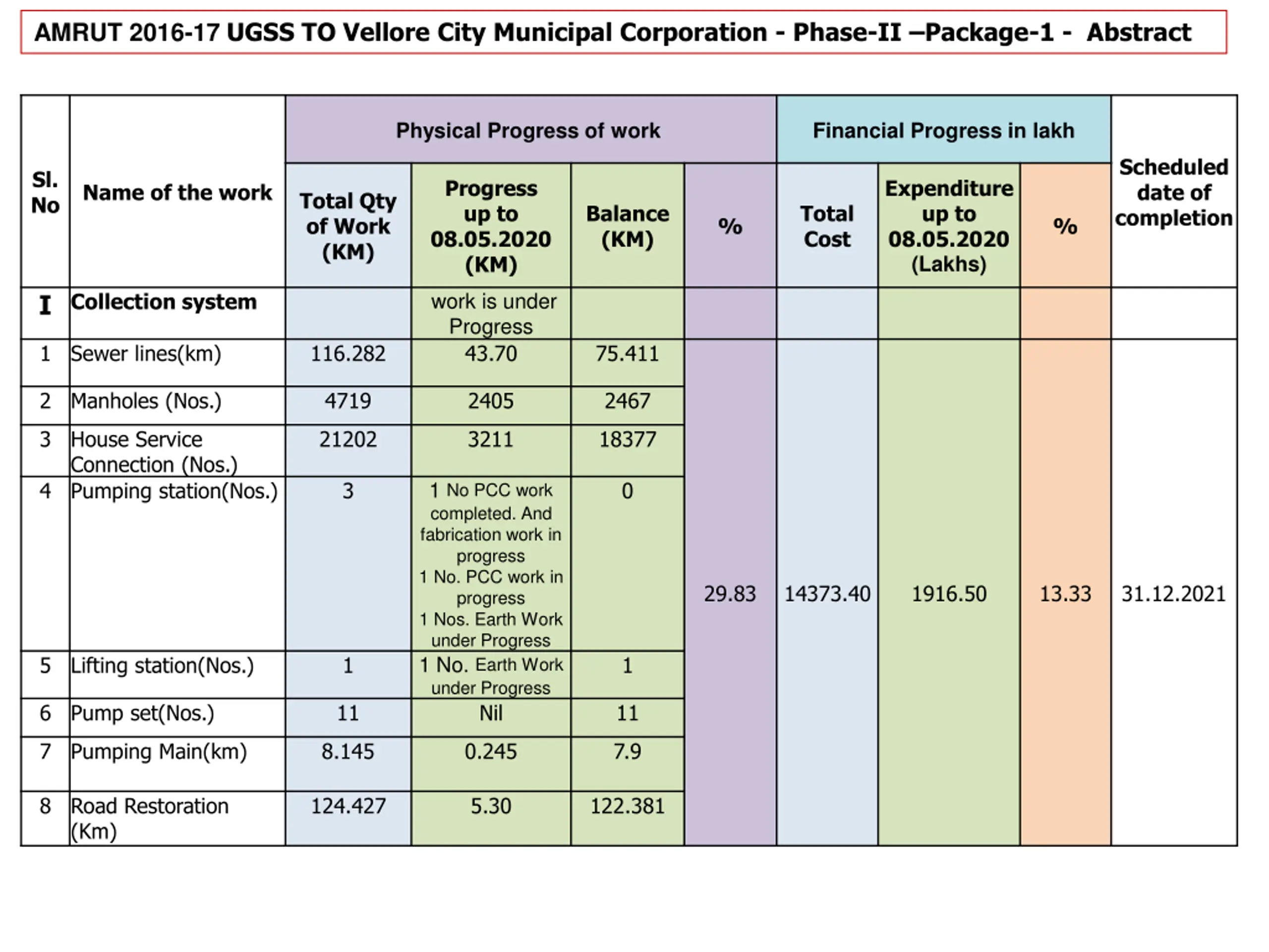 AMRUT 2016-17 UGSS TO Vellore City Municipal Corporation - Phase-II Package-2 - Abstract Physical Progress of work Financial Progress in lakh Scheduled date of completion Sl. No Progress up to 08.05.2020 (KM) Expenditure up to 08.05.2020 (Lakhs) Name of the work Total Qty of Work (KM) Balance (KM) Total Cost % % I Collection system work is under Progress 25.80 1 Sewer lines(km) 93.119 69.399 2 Manholes (Nos.) 3930 1695 2319 3 House Service Connection (Nos.) Pumping station(Nos.) 22068 1217 21021 4 2 1 1 No Earth work in progress. 2 No Earth work in progress Nil 5 Lifting station(Nos.) 6 4 19.59 16341.34 1366.82 8.36 31.12.2021 6 Pump set(Nos.) 21 21 7 Pumping Main(km) 6.285 Nil 6.285 8 Pipe caring Bridge (650m) Road Restoration (Km) 1 No. Nil 1 No. 9 99.404 4.50 94.904