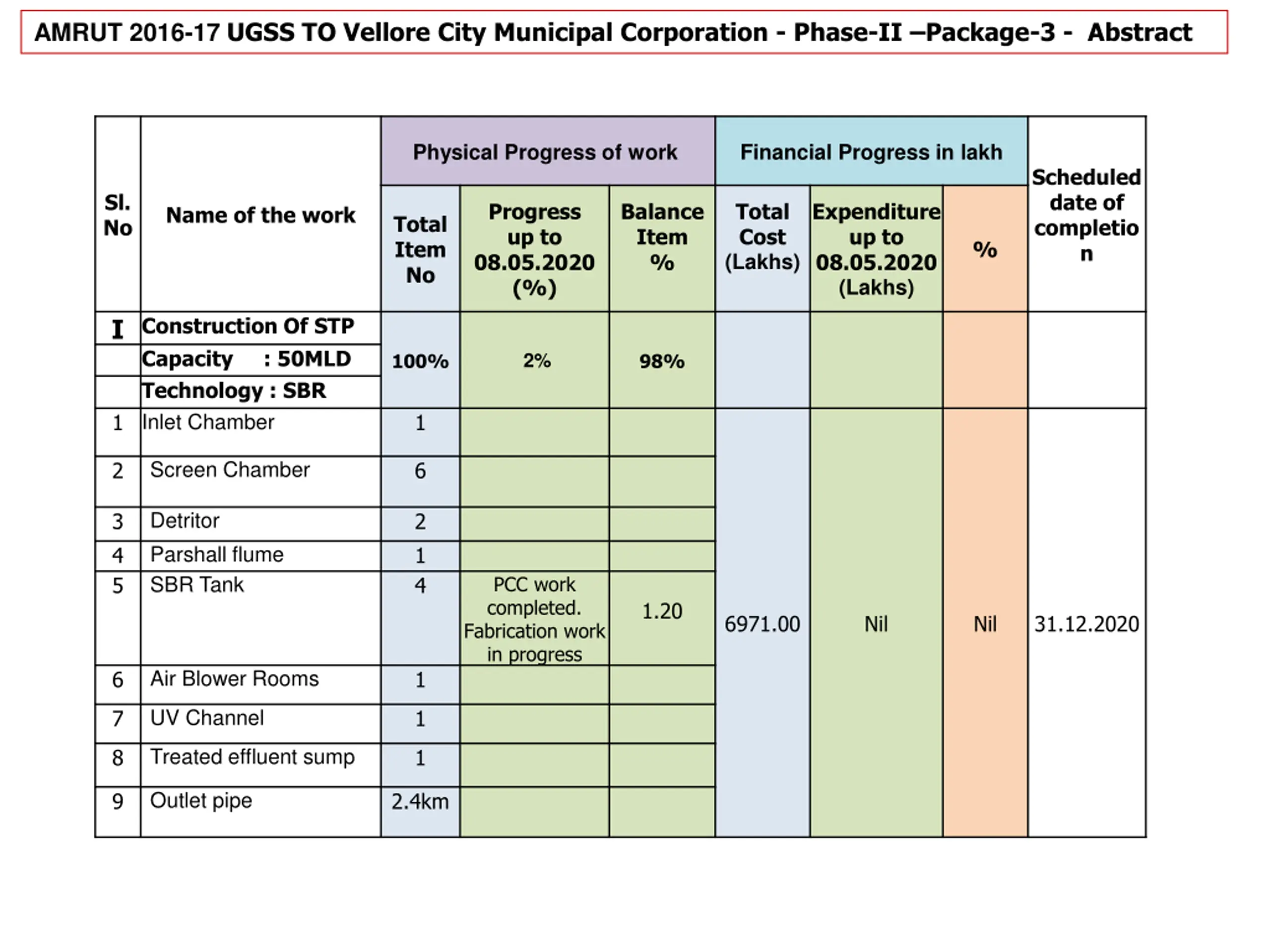 AMRUT 2016-17 UGSS TO Vellore City Municipal Corporation - Phase-II Package-3 - Abstract Physical Progress of work Financial Progress in lakh Scheduled date of completio n Sl. No Progress up to 08.05.2020 (%) Balance Item % Total Cost (Lakhs) Expenditure up to 08.05.2020 (Lakhs) Name of the work Total Item No % I Construction Of STP Capacity : 50MLD Technology : SBR 1 Inlet Chamber 2% 100% 98% 1 Screen Chamber 2 6 Detritor Parshall flume SBR Tank 3 4 5 2 1 4 PCC work completed. Fabrication work in progress 1.20 6971.00 Nil Nil 31.12.2020 Air Blower Rooms 6 1 UV Channel 7 1 Treated effluent sump 8 1 Outlet pipe 9 2.4km