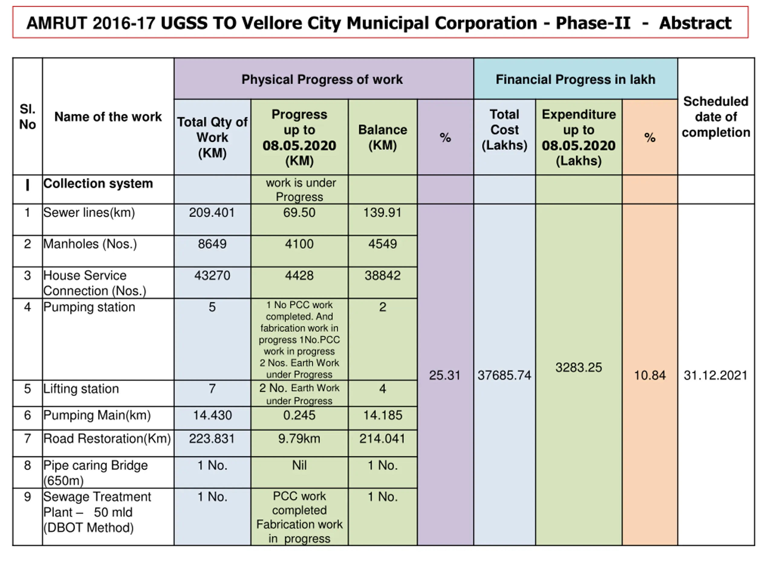 AMRUT 2016-17 UGSS TO Vellore City Municipal Corporation - Phase-II - Abstract Physical Progress of work Financial Progress in lakh Scheduled date of completion Sl. No Progress up to 08.05.2020 (KM) Total Cost (Lakhs) Expenditure up to 08.05.2020 (Lakhs) Name of the work Total Qty of Work (KM) Balance (KM) % % work is under Progress 69.50 I Collection system 1 Sewer lines(km) 209.401 139.91 2 Manholes (Nos.) 8649 4100 4549 3 House Service Connection (Nos.) Pumping station 43270 4428 38842 1 No PCC work completed. And fabrication work in progress 1No.PCC work in progress 2 Nos. Earth Work under Progress 2 No. Earth Work under Progress 0.245 4 5 2 3283.25 25.31 37685.74 10.84 31.12.2021 5 Lifting station 7 4 6 Pumping Main(km) 14.430 14.185 7 Road Restoration(Km) 223.831 9.79km 214.041 8 Pipe caring Bridge (650m) Sewage Treatment Plant 50 mld (DBOT Method) 1 No. Nil 1 No. PCC work completed Fabrication work in progress 9 1 No. 1 No.