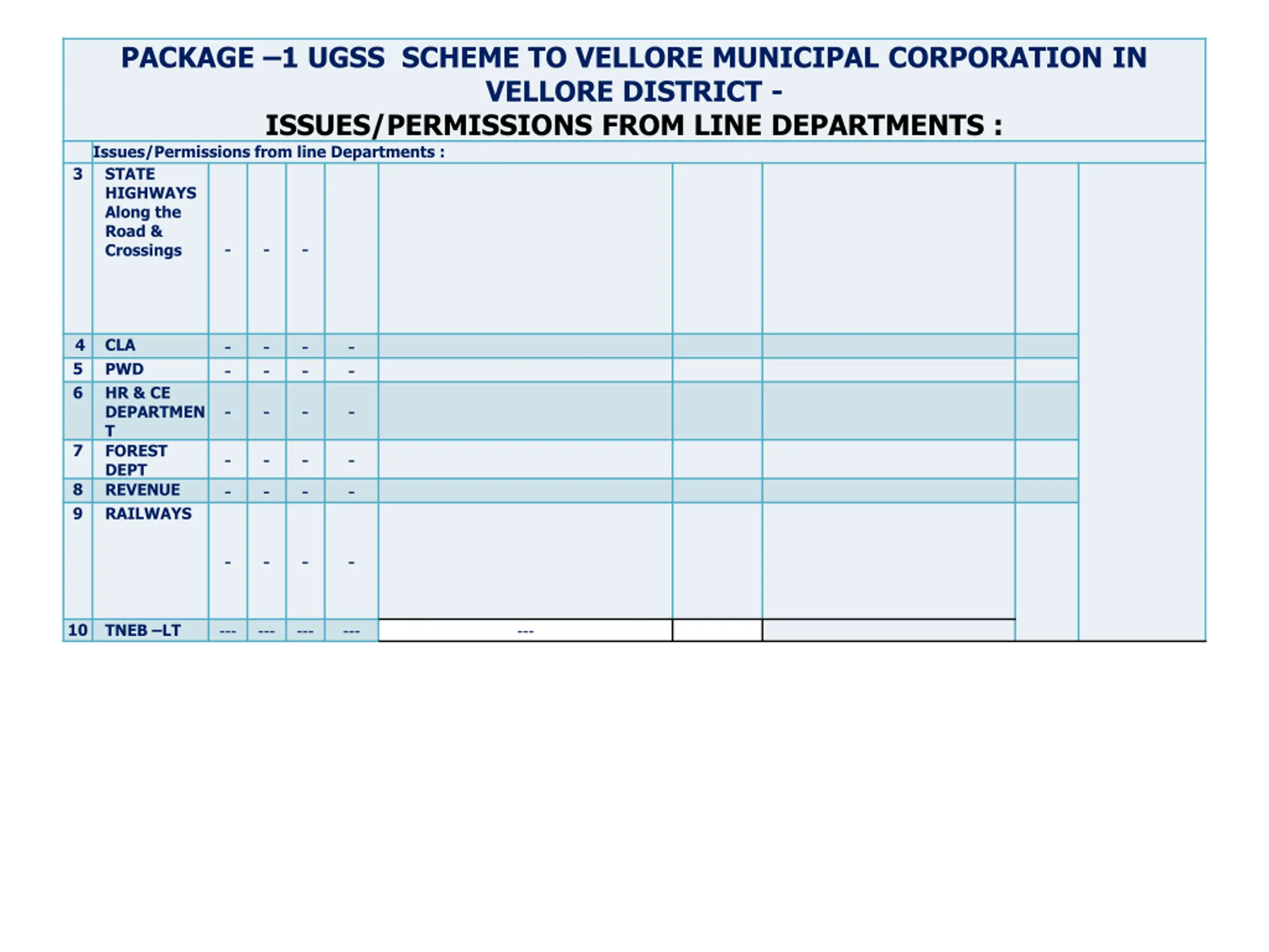 PACKAGE 1 UGSS SCHEME TO VELLORE MUNICIPAL CORPORATION IN VELLORE DISTRICT - ISSUES/PERMISSIONS FROM LINE DEPARTMENTS : Issues/Permissions from line Departments : STATE HIGHWAYS Along the Road & Crossings - - - 3 - - - - - - - - 4 5 6 CLA PWD HR & CE DEPARTMEN T FOREST DEPT REVENUE RAILWAYS - - - - 7 - - - - - - - - 8 9 - - - - 10 TNEB LT --- --- --- --- ---