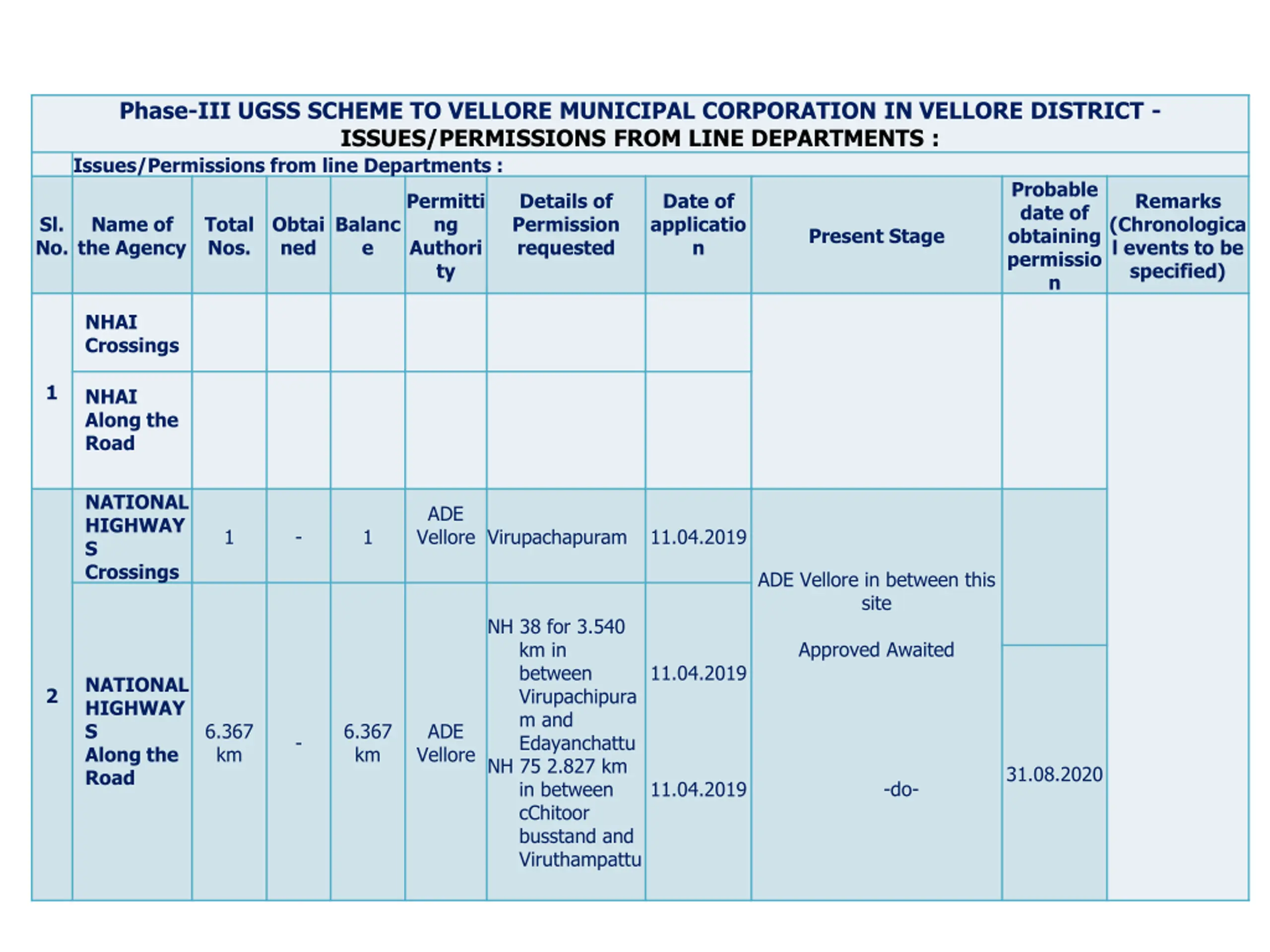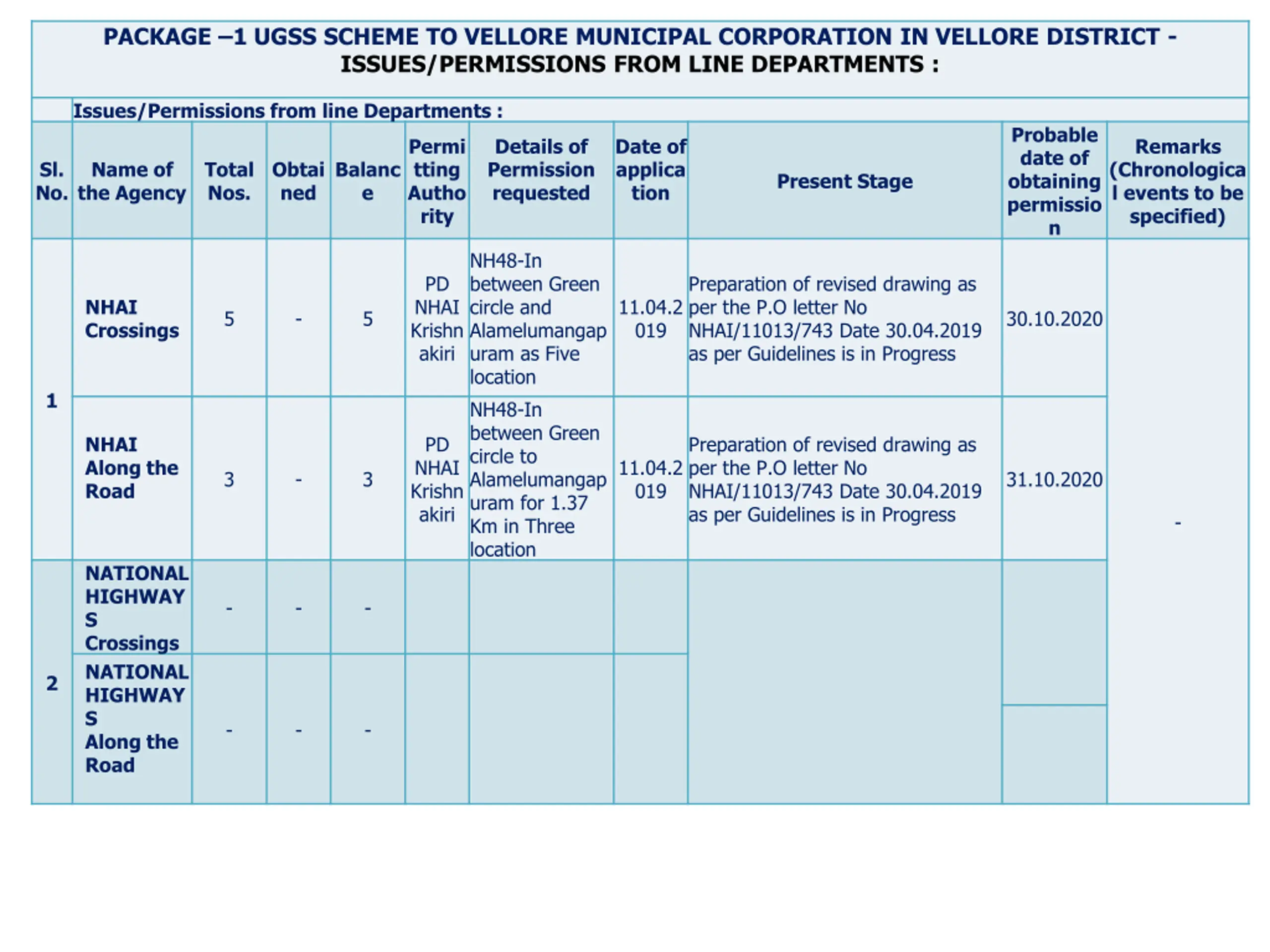 PACKAGE 1 UGSS SCHEME TO VELLORE MUNICIPAL CORPORATION IN VELLORE DISTRICT - ISSUES/PERMISSIONS FROM LINE DEPARTMENTS : Issues/Permissions from line Departments : Probable date of obtaining permissio n Permi tting Autho rity Details of Permission requested Date of applica tion Remarks (Chronologica l events to be specified) Sl. No. Name of the Agency Total Nos. Obtai ned Balanc e Present Stage NH48-In between Green circle and Alamelumangap uram as Five location NH48-In between Green circle to Alamelumangap uram for 1.37 Km in Three location PD NHAI Krishn akiri Preparation of revised drawing as per the P.O letter No NHAI/11013/743 Date 30.04.2019 as per Guidelines is in Progress NHAI Crossings 11.04.2 019 5 - 5 30.10.2020 1 NHAI Along the Road PD NHAI Krishn akiri Preparation of revised drawing as per the P.O letter No NHAI/11013/743 Date 30.04.2019 as per Guidelines is in Progress 11.04.2 019 3 - 3 31.10.2020 - NATIONAL HIGHWAY S Crossings NATIONAL HIGHWAY S Along the Road - - - 2 - - -