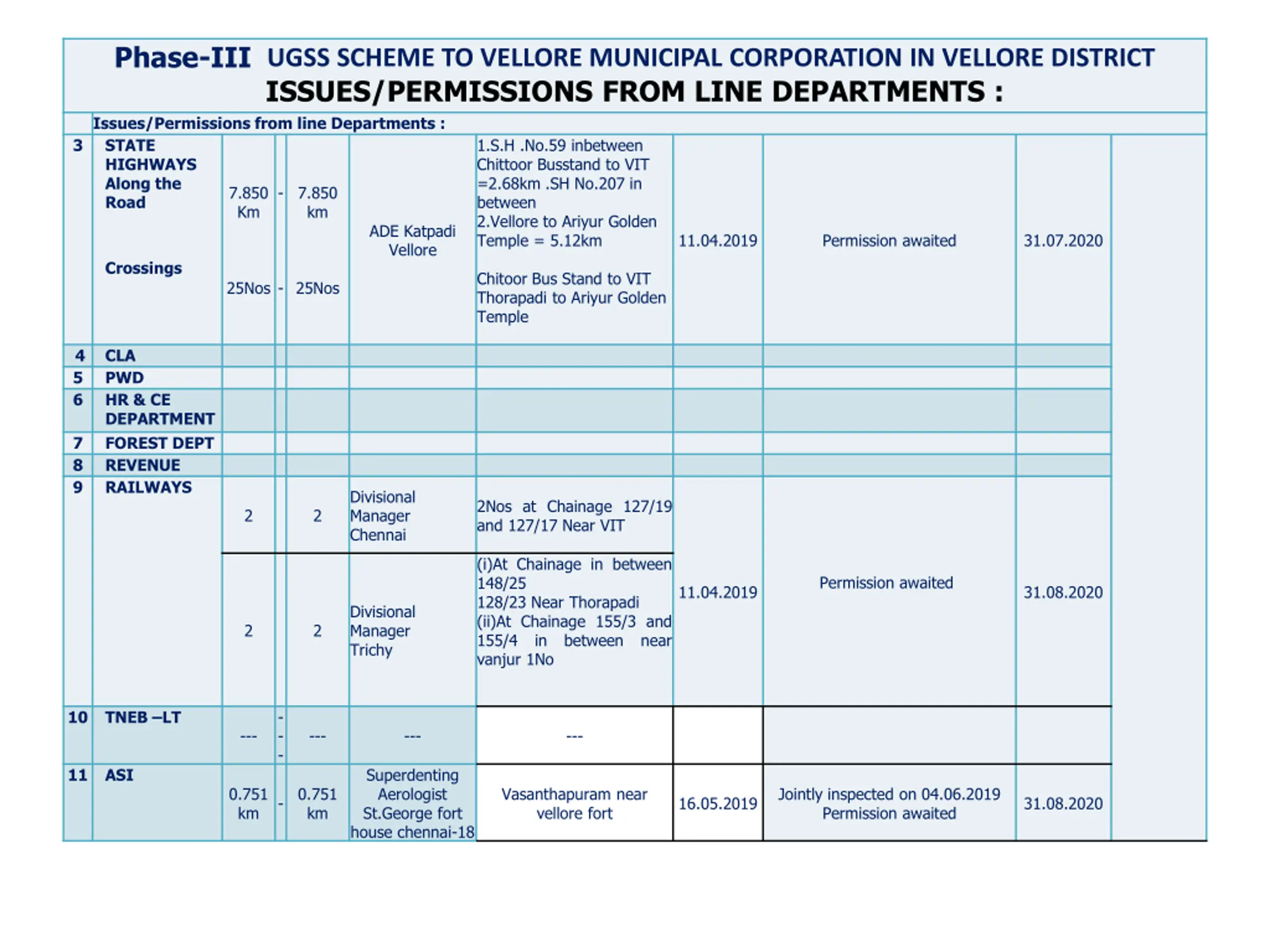 PACKAGE 3 UGSS SCHEME TO VELLORE MUNICIPAL CORPORATION IN VELLORE DISTRICT - ISSUES/PERMISSIONS FROM LINE DEPARTMENTS : Issues/Permissions from line Departments : Probable date of obtaining permissio n Permi tting Autho rity Details of Permission requested Date of applica tion Remarks (Chronologica l events to be specified) Sl. No. Name of the Agency Total Nos. Obtai ned Balanc e Present Stage NHAI Crossings - - - - - - - 1 - NHAI Along the Road - - - - - - - NATIONAL HIGHWAY S Crossings - - - - - - - - 2 - NATIONAL HIGHWAY S Along the Road - - - - - - -