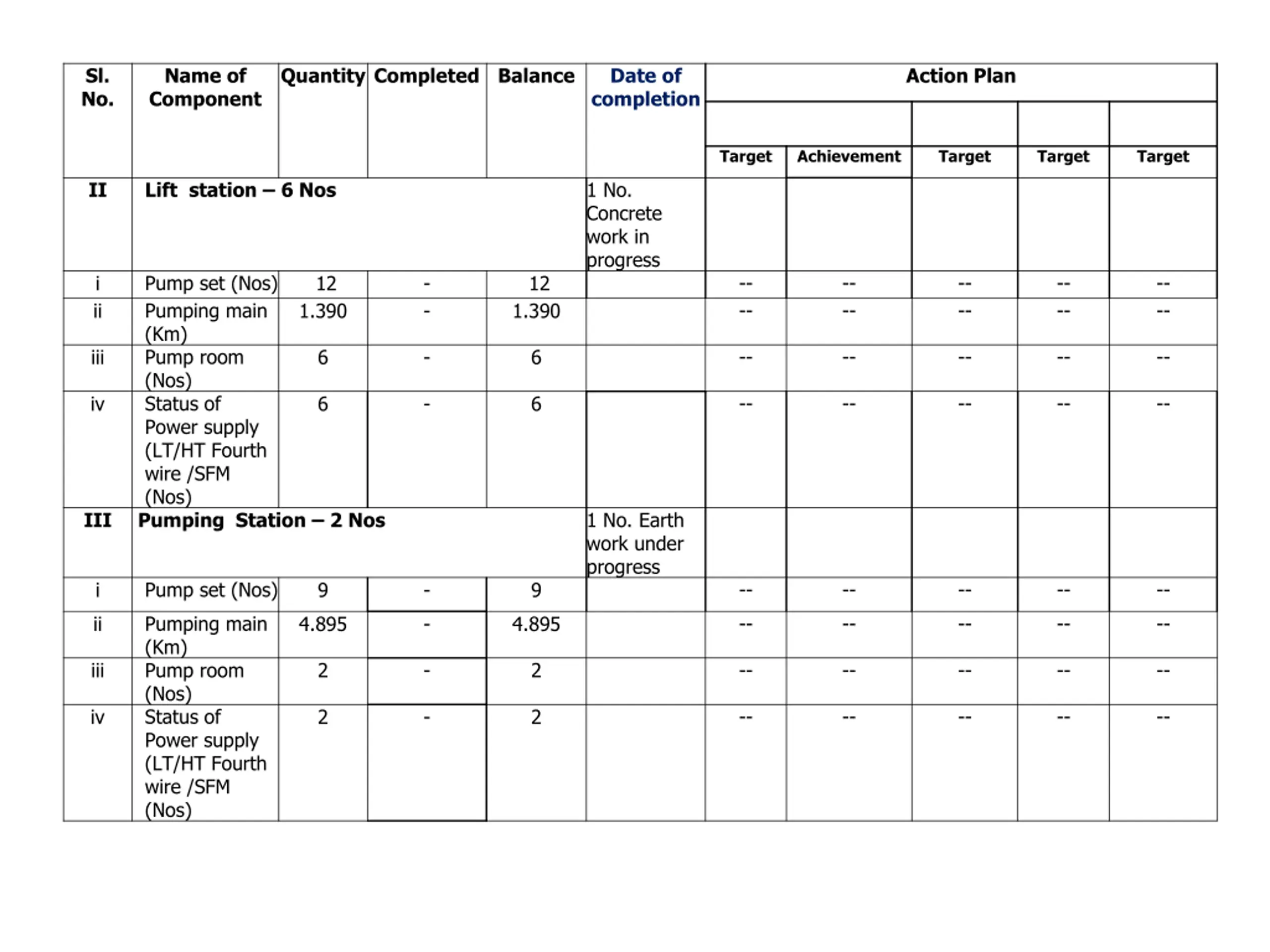 Sl. No. Name of Component Quantity Completed Balance Date of completion Action Plan Target Achievement Target Target Target II Lift station 6 Nos 1 No. Concrete work in progress Pump set (Nos) Pumping main (Km) Pump room (Nos) Status of Power supply (LT/HT Fourth wire /SFM (Nos) Pumping Station 2 Nos -- -- -- -- -- -- -- -- -- -- i ii 12 - - 12 1.390 1.390 -- -- -- -- -- iii 6 - 6 -- -- -- -- -- iv 6 - 6 III 1 No. Earth work under progress Pump set (Nos) -- -- -- -- -- i 9 - 9 Pumping main (Km) Pump room (Nos) Status of Power supply (LT/HT Fourth wire /SFM (Nos) -- -- -- -- -- ii 4.895 - 4.895 -- -- -- -- -- iii 2 - 2 -- -- -- -- -- iv 2 - 2