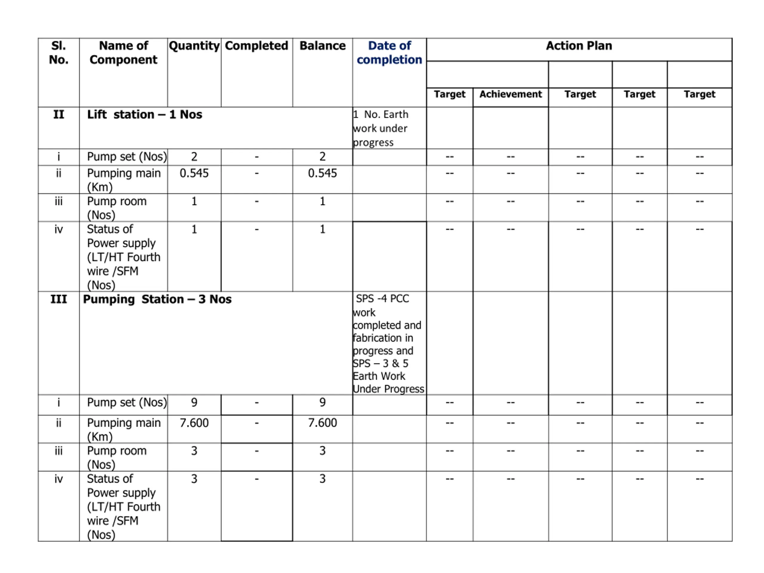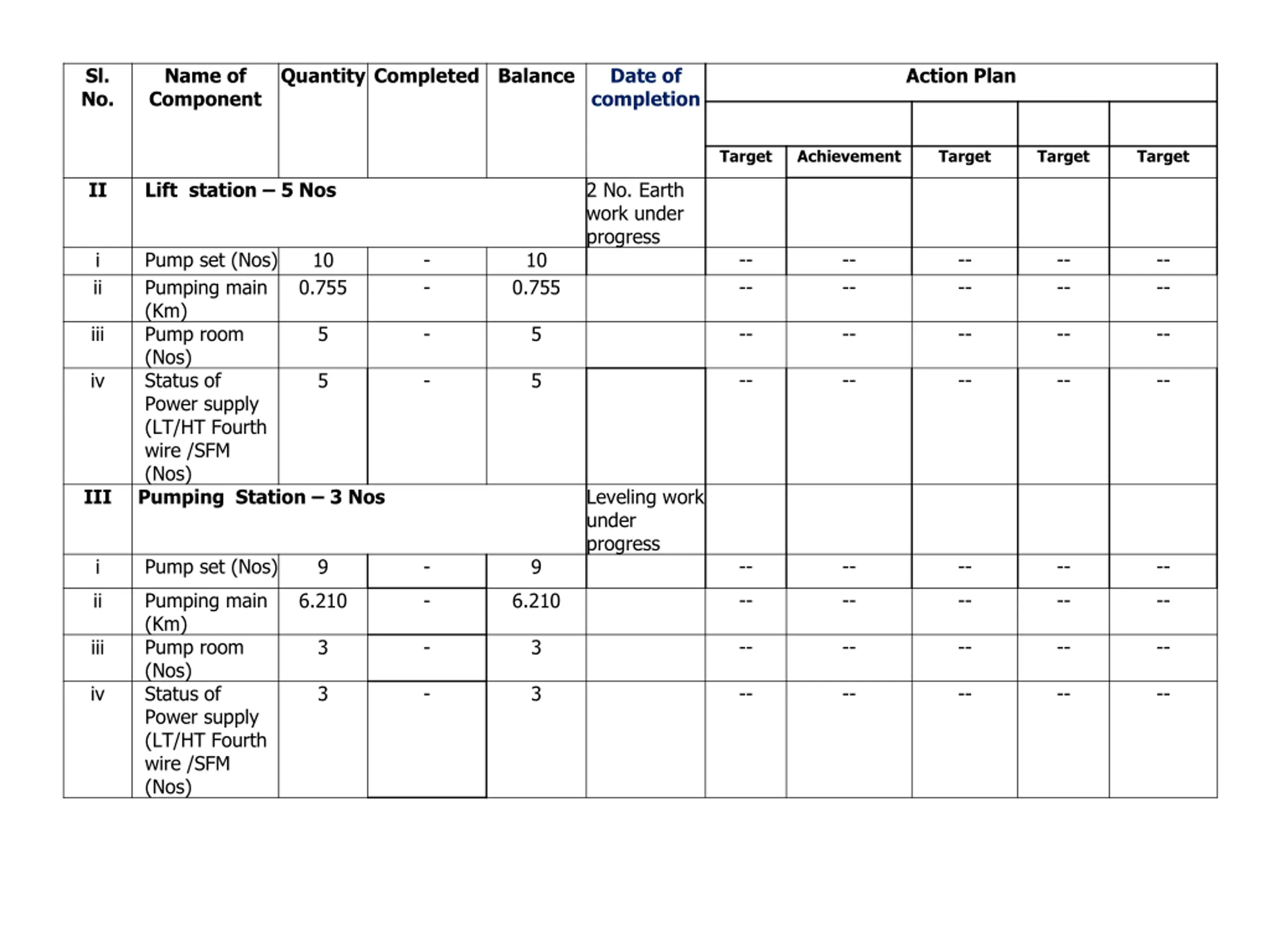 Sl. No. Name of Component Quantity Completed Balance Date of completion Action Plan Target Achievement Target Target Target II Lift station 5 Nos 2 No. Earth work under progress Pump set (Nos) Pumping main (Km) Pump room (Nos) Status of Power supply (LT/HT Fourth wire /SFM (Nos) Pumping Station 3 Nos -- -- -- -- -- -- -- -- -- -- i ii 10 - - 10 0.755 0.755 -- -- -- -- -- iii 5 - 5 -- -- -- -- -- iv 5 - 5 III Leveling work under progress Pump set (Nos) -- -- -- -- -- i 9 - 9 Pumping main (Km) Pump room (Nos) Status of Power supply (LT/HT Fourth wire /SFM (Nos) -- -- -- -- -- ii 6.210 - 6.210 -- -- -- -- -- iii 3 - 3 -- -- -- -- -- iv 3 - 3