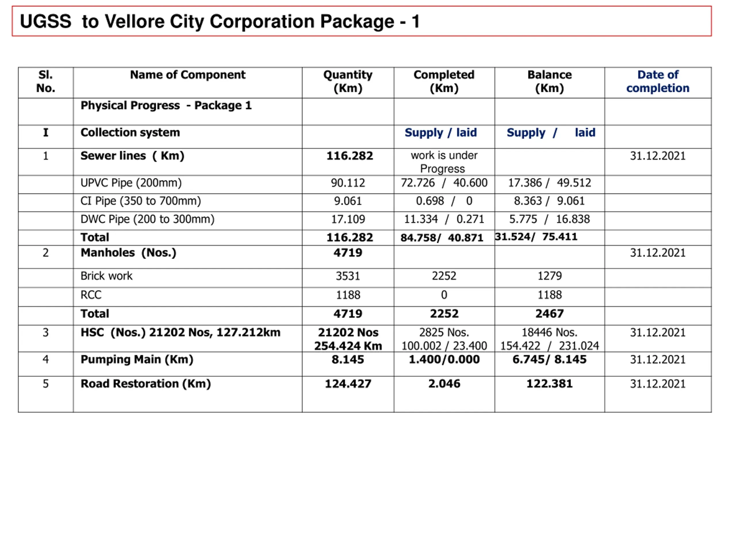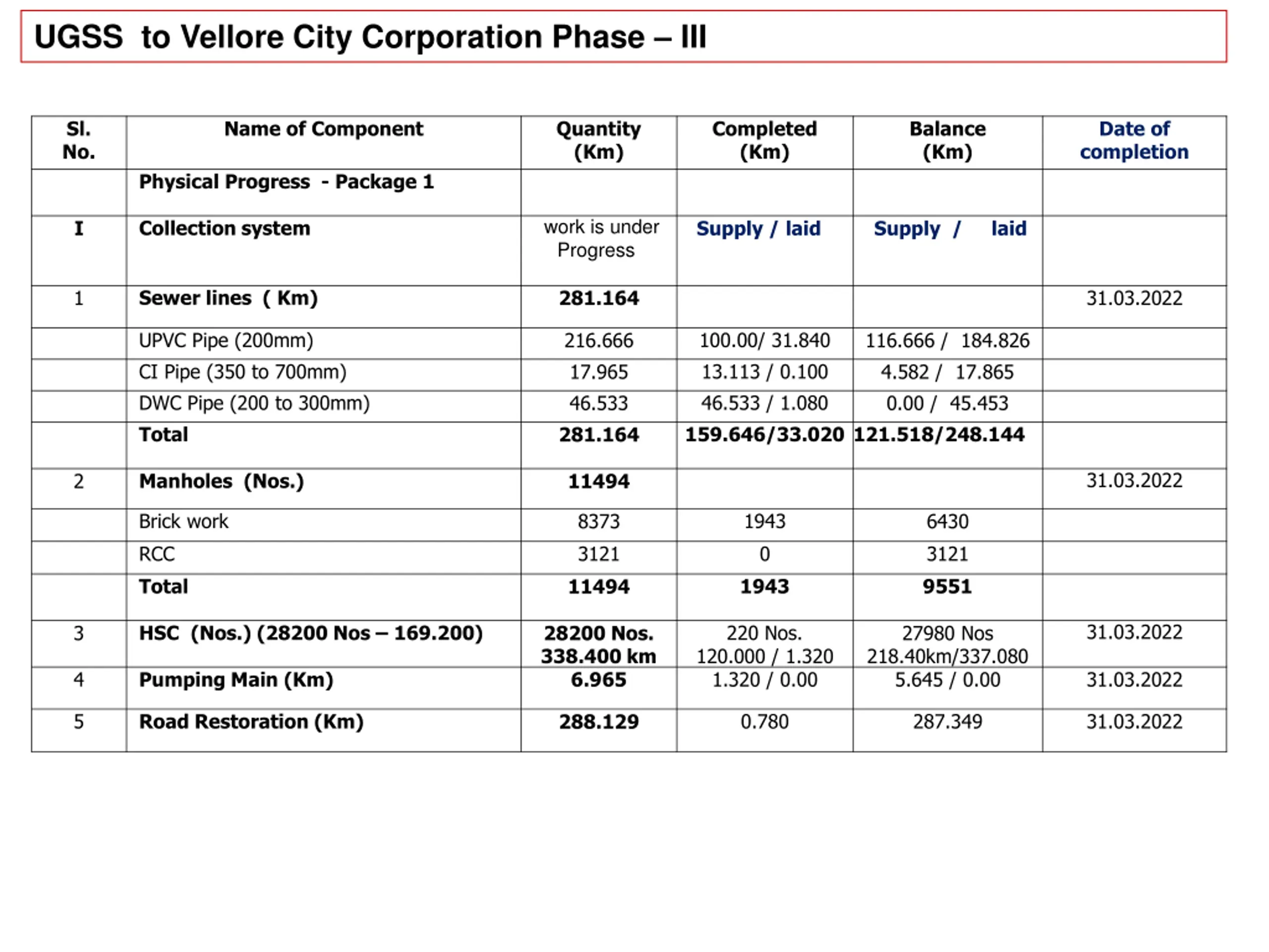 UGSS to Vellore City Corporation Phase III Sl. No. Name of Component Quantity (Km) Completed (Km) Balance (Km) Date of completion Physical Progress - Package 1 work is under Progress Collection system I Supply / laid Supply / laid Sewer lines ( Km) 1 281.164 31.03.2022 UPVC Pipe (200mm) CI Pipe (350 to 700mm) DWC Pipe (200 to 300mm) Total 100.00/ 31.840 13.113 / 0.100 46.533 / 1.080 159.646/33.020 121.518/248.144 216.666 17.965 46.533 281.164 116.666 / 184.826 4.582 / 17.865 0.00 / 45.453 31.03.2022 Manholes (Nos.) 2 11494 Brick work RCC Total 1943 0 1943 8373 3121 11494 6430 3121 9551 31.03.2022 HSC (Nos.) (28200 Nos 169.200) 220 Nos. 120.000 / 1.320 1.320 / 0.00 3 28200 Nos. 338.400 km 6.965 27980 Nos 218.40km/337.080 5.645 / 0.00 4 Pumping Main (Km) 31.03.2022 5 Road Restoration (Km) 0.780 287.349 31.03.2022 288.129