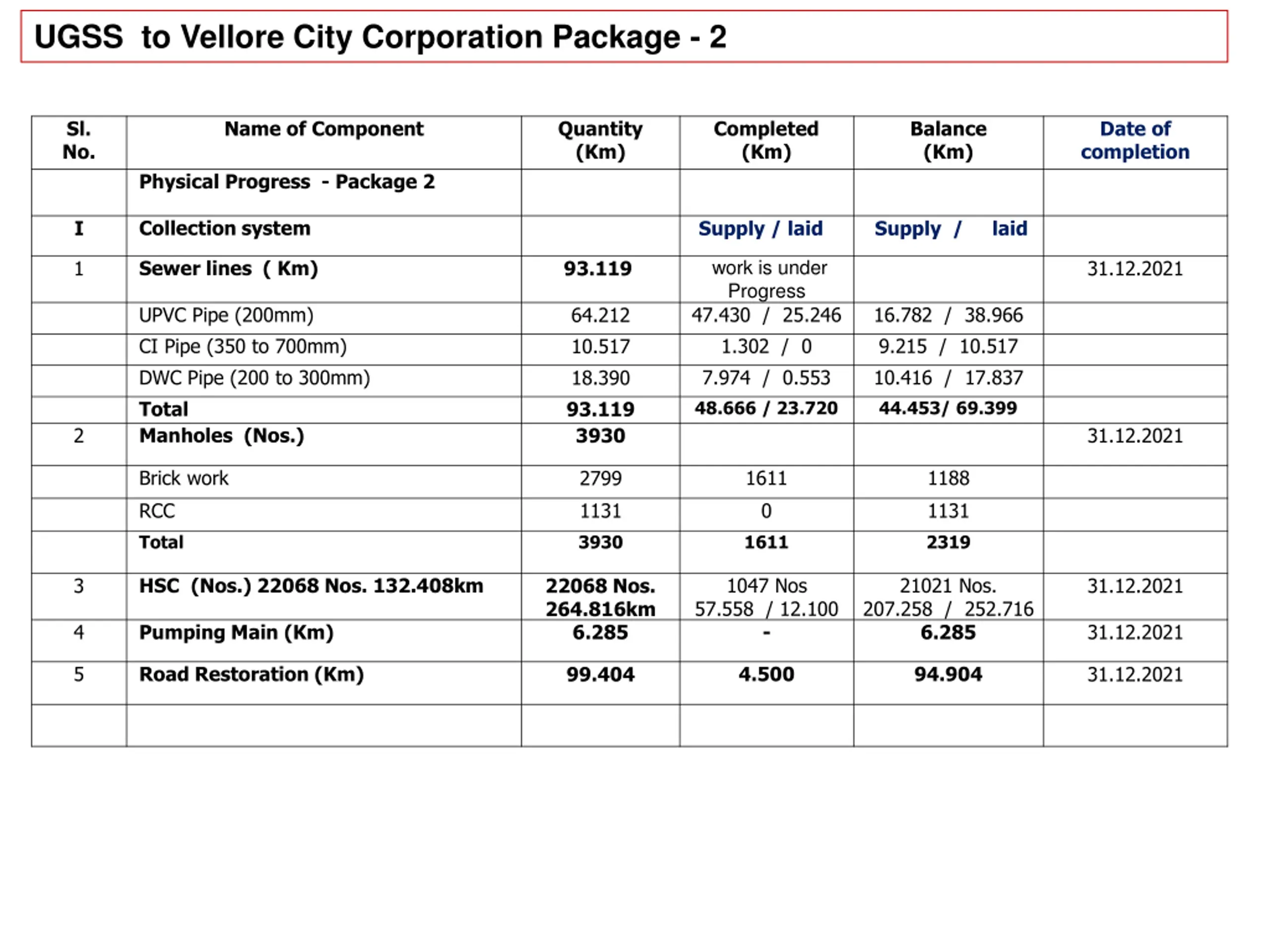UGSS to Vellore City Corporation Package - 2 Sl. No. Name of Component Quantity (Km) Completed (Km) Balance (Km) Date of completion Physical Progress - Package 2 Collection system I Supply / laid Supply / laid Sewer lines ( Km) work is under Progress 47.430 / 25.246 1.302 / 0 7.974 / 0.553 48.666 / 23.720 1 93.119 31.12.2021 UPVC Pipe (200mm) CI Pipe (350 to 700mm) DWC Pipe (200 to 300mm) Total Manholes (Nos.) 16.782 / 38.966 9.215 / 10.517 10.416 / 17.837 44.453/ 69.399 64.212 10.517 18.390 93.119 3930 2 31.12.2021 Brick work RCC 1611 0 1188 1131 2799 1131 Total 3930 1611 2319 HSC (Nos.) 22068 Nos. 132.408km 1047 Nos 57.558 / 12.100 - 21021 Nos. 207.258 / 252.716 6.285 3 22068 Nos. 264.816km 6.285 31.12.2021 4 Pumping Main (Km) 31.12.2021 5 Road Restoration (Km) 4.500 94.904 99.404 31.12.2021
