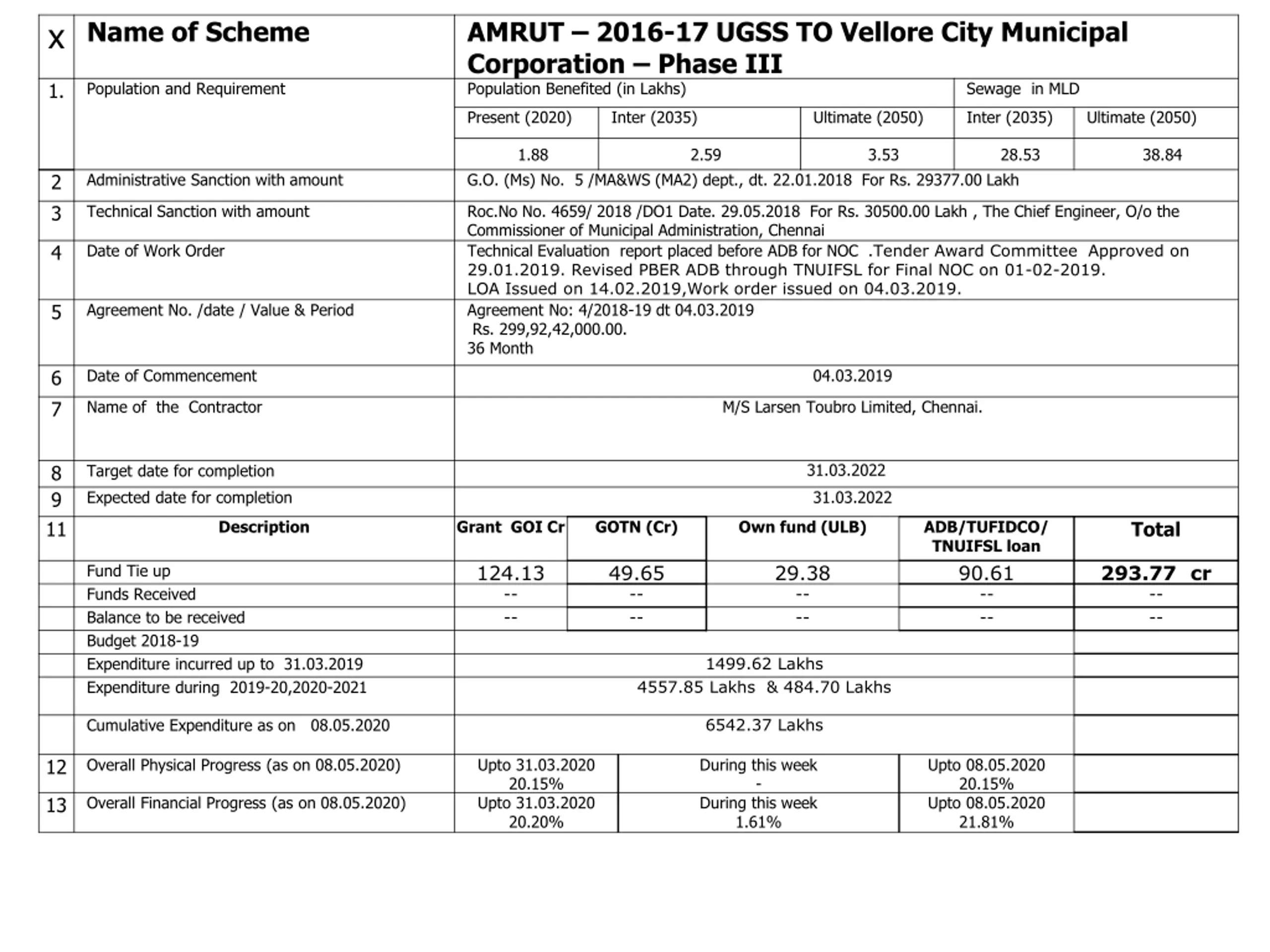 x Name of Scheme AMRUT 2016-17 UGSS TO Vellore City Municipal Corporation Phase III Population Benefited (in Lakhs) 1. Population and Requirement Sewage in MLD Present (2020) Inter (2035) Ultimate (2050) Inter (2035) Ultimate (2050) 1.88 2.59 3.53 28.53 38.84 2 3 Administrative Sanction with amount G.O. (Ms) No. 5 /MA&WS (MA2) dept., dt. 22.01.2018 For Rs. 29377.00 Lakh Technical Sanction with amount Roc.No No. 4659/ 2018 /DO1 Date. 29.05.2018 For Rs. 30500.00 Lakh , The Chief Engineer, O/o the Commissioner of Municipal Administration, Chennai Technical Evaluation report placed before ADB for NOC .Tender Award Committee Approved on 29.01.2019. Revised PBER ADB through TNUIFSL for Final NOC on 01-02-2019. LOA Issued on 14.02.2019,Work order issued on 04.03.2019. Agreement No: 4/2018-19 dt 04.03.2019 Rs. 299,92,42,000.00. 36 Month 4 Date of Work Order 5 Agreement No. /date / Value & Period 6 7 Date of Commencement 04.03.2019 Name of the Contractor M/S Larsen Toubro Limited, Chennai. 31.03.2022 8 9 11 Target date for completion Expected date for completion 31.03.2022 Total Description Grant GOI Cr GOTN (Cr) Own fund (ULB) ADB/TUFIDCO/ TNUIFSL loan 90.61 -- -- 124.13 -- -- 49.65 -- -- 29.38 -- -- 293.77 cr -- -- Fund Tie up Funds Received Balance to be received Budget 2018-19 Expenditure incurred up to 31.03.2019 Expenditure during 2019-20,2020-2021 1499.62 Lakhs 4557.85 Lakhs & 484.70 Lakhs 6542.37 Lakhs Cumulative Expenditure as on 08.05.2020 12 Overall Physical Progress (as on 08.05.2020) Upto 31.03.2020 20.15% Upto 31.03.2020 20.20% During this week - During this week 1.61% Upto 08.05.2020 20.15% Upto 08.05.2020 21.81% 13 Overall Financial Progress (as on 08.05.2020)