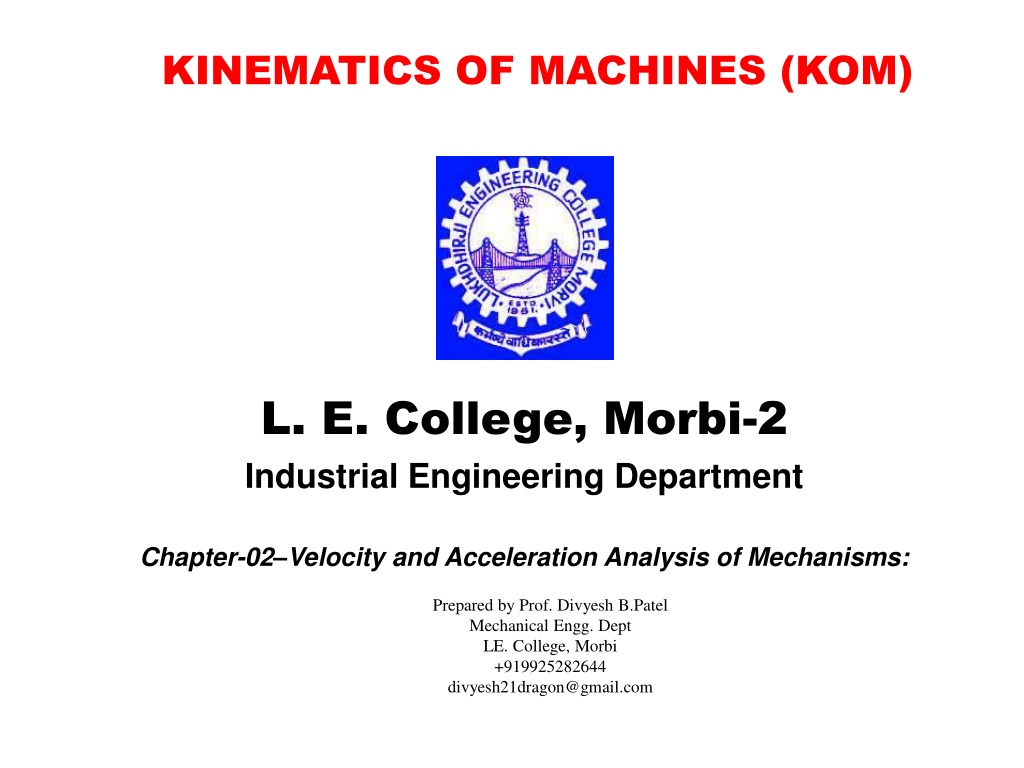 KINEMATICS OF MACHINES (KOM) L. E. College, Morbi-2 Industrial Engineering Department Chapter-02 Velocity and Acceleration Analysis of Mechanisms: Prepared by Prof. Divyesh B.Patel Mechanical Engg. Dept LE. College, Morbi +919925282644 divyesh21dragon@gmail.com