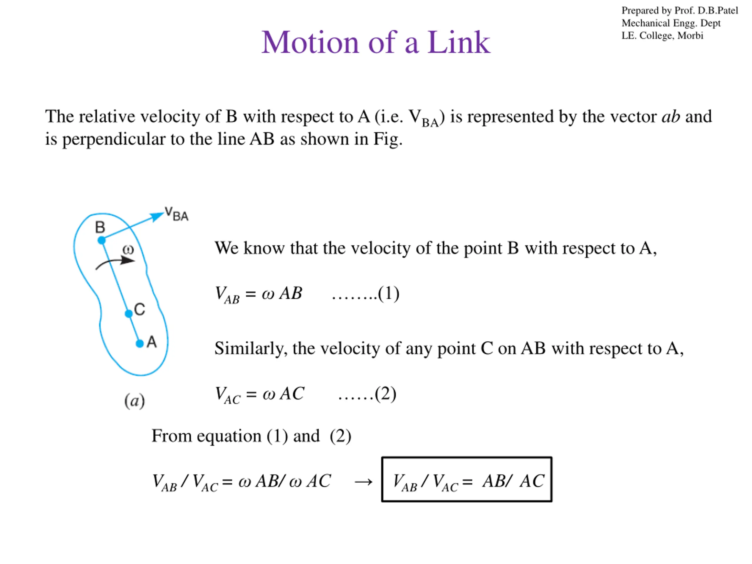Prepared by Prof. D.B.Patel Mechanical Engg. Dept LE. College, Morbi Motion of a Link The relative velocity of B with respect to A (i.e. VBA) is represented by the vector ab and is perpendicular to the line AB as shown in Fig. We know that the velocity of the point B with respect to A, VAB = AB ..(1) Similarly, the velocity of any point C on AB with respect to A, VAC = AC (2) From equation (1) and (2) VAB / VAC = AB/ AC VAB / VAC = AB/ AC