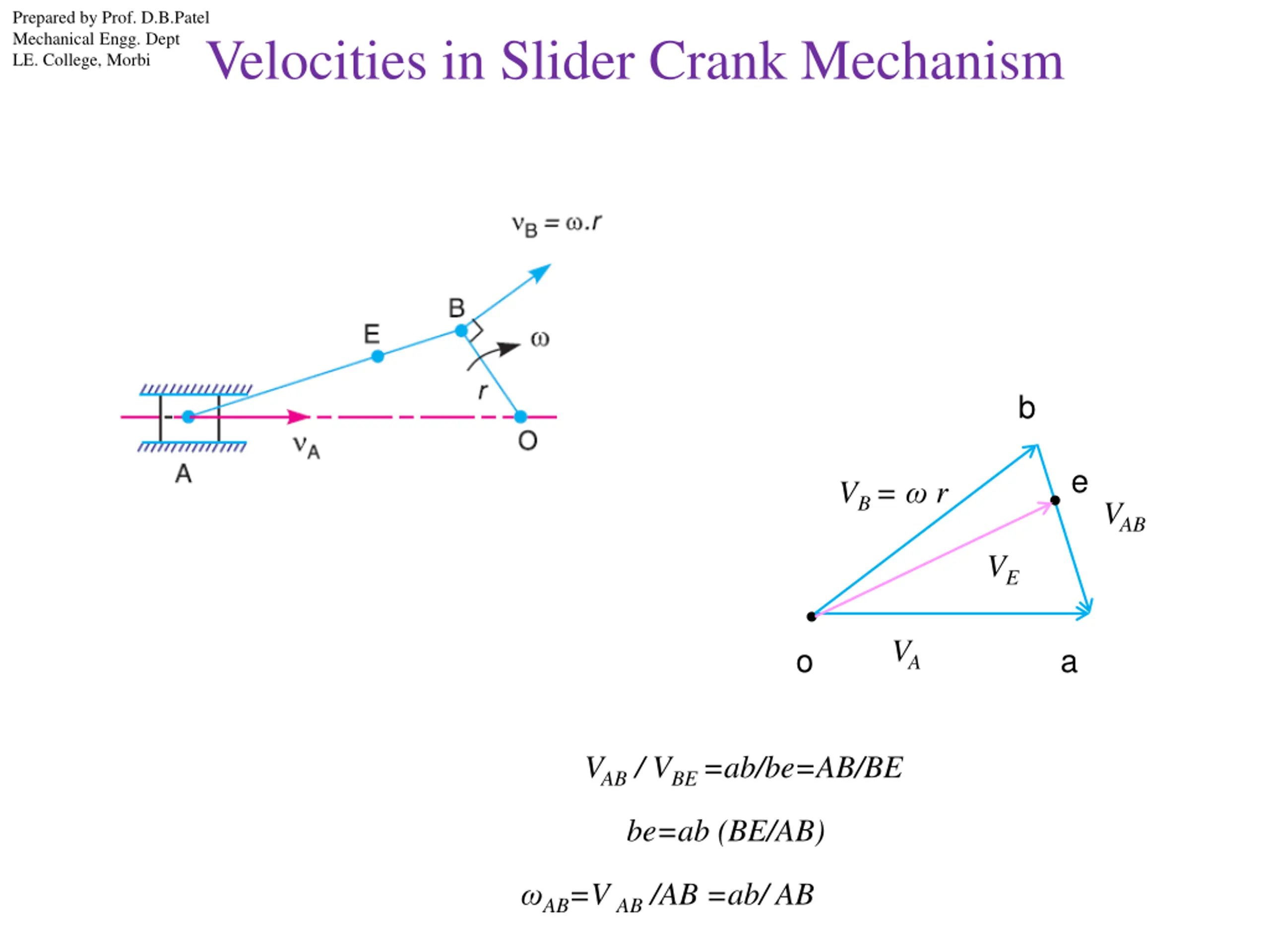Prepared by Prof. D.B.Patel Mechanical Engg. Dept LE. College, Morbi Velocities in Slider Crank Mechanism b e VB = r VAB VE VA o a VAB / VBE =ab/be=AB/BE be=ab (BE/AB) AB=VAB /AB =ab/ AB