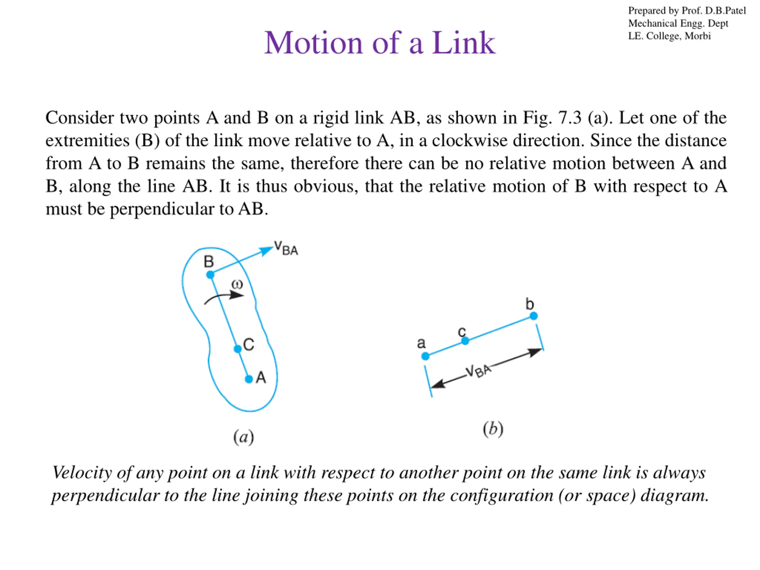 Prepared by Prof. D.B.Patel Mechanical Engg. Dept LE. College, Morbi Motion of a Link Consider two points A and B on a rigid link AB, as shown in Fig. 7.3 (a). Let one of the extremities (B) of the link move relative to A, in a clockwise direction. Since the distance from A to B remains the same, therefore there can be no relative motion between A and B, along the line AB. It is thus obvious, that the relative motion of B with respect to A must be perpendicular to AB. Velocity of any point on a link with respect to another point on the same link is always perpendicular to the line joining these points on the configuration (or space) diagram.