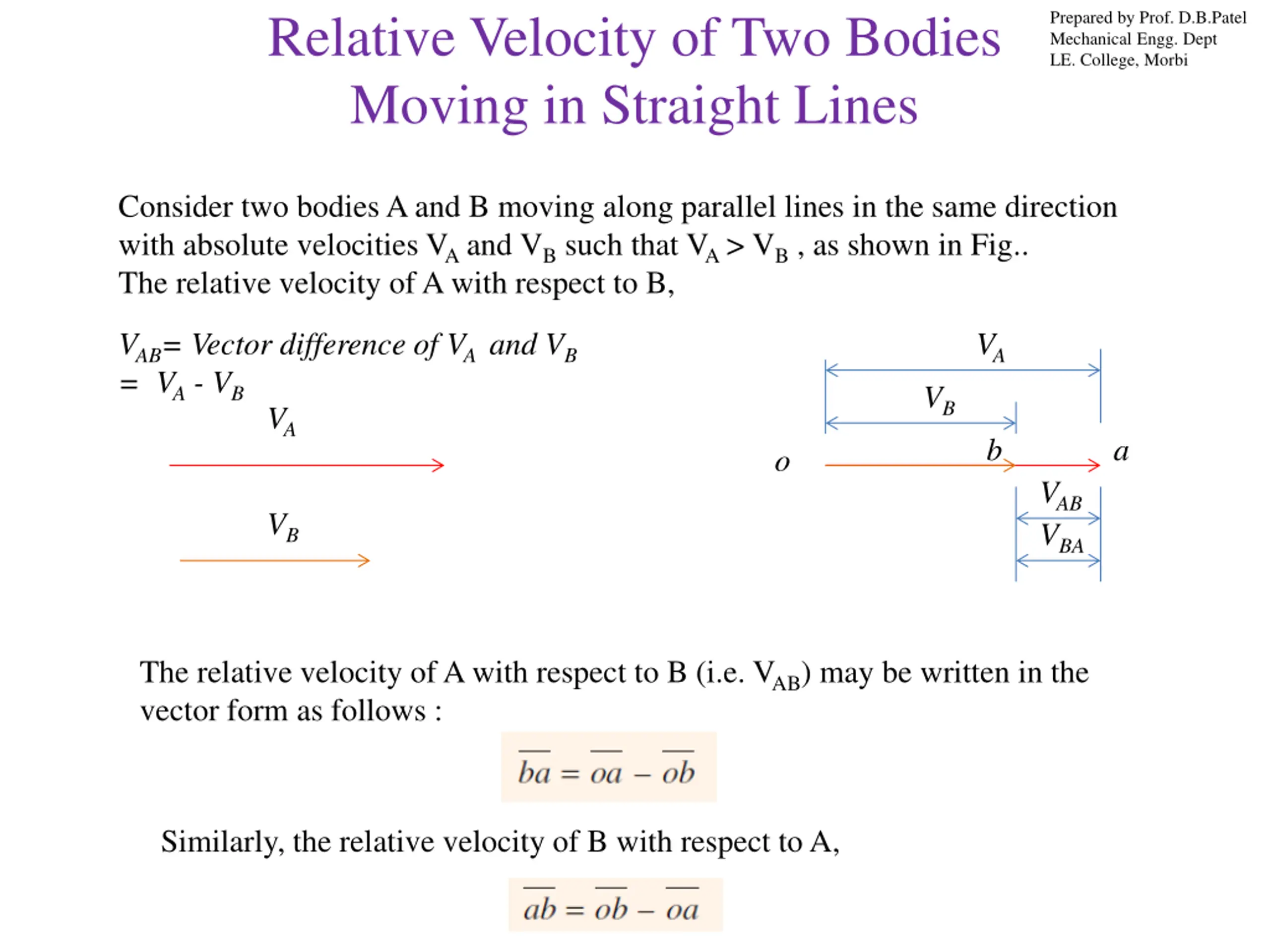Relative Velocity of Two Bodies Moving in Straight Lines Prepared by Prof. D.B.Patel Mechanical Engg. Dept LE. College, Morbi Now consider the body B moving in an inclined direction as shown in Fig (a). The relative velocity of A with respect to B may be obtained by the law of parallelogram of velocities or triangle law of velocities. Take any fixed point o and draw vector oa to represent VA in magnitude and direction to some suitable scale. Similarly, draw vector ob to represent VB in magnitude and direction to the same scale. Then vector ba represents the relative velocity of A with respect to B as shown in Fig (b). In the similar way as discussed above, the relative velocity of A with respect to B, The relative velocity of A with respect to B,