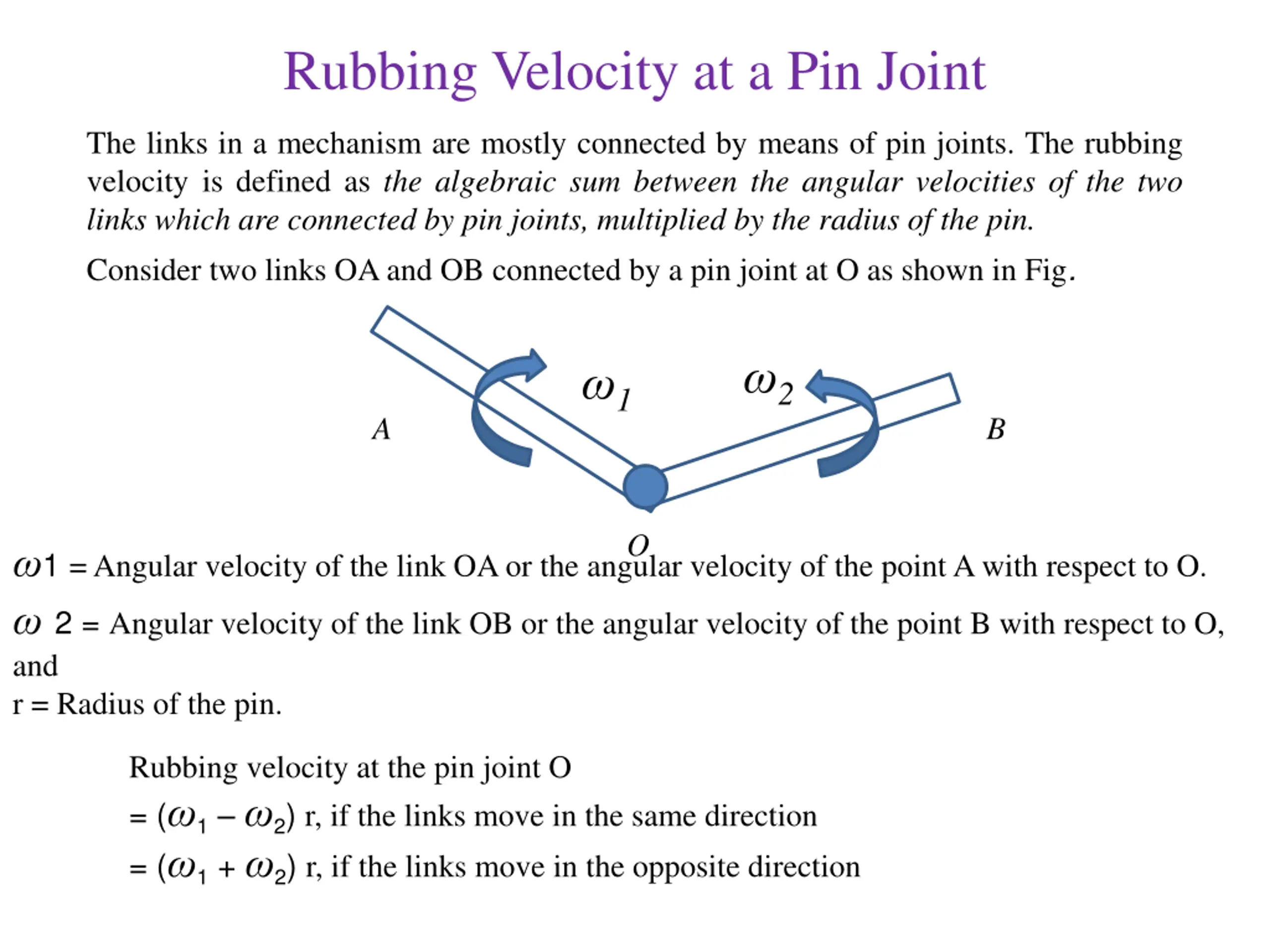 Rubbing Velocity at a Pin Joint The links in a mechanism are mostly connected by means of pin joints. The rubbing velocity is defined as the algebraic sum between the angular velocities of the two links which are connected by pin joints, multiplied by the radius of the pin. Consider two links OA and OB connected by a pin joint at O as shown in Fig. 2 1 A B O 1 = Angular velocity of the link OA or the angular velocity of the point A with respect to O. 2 = Angular velocity of the link OB or the angular velocity of the point B with respect to O, and r = Radius of the pin. Rubbing velocity at the pin joint O = ( 1 2) r, if the links move in the same direction = ( 1 + 2) r, if the links move in the opposite direction