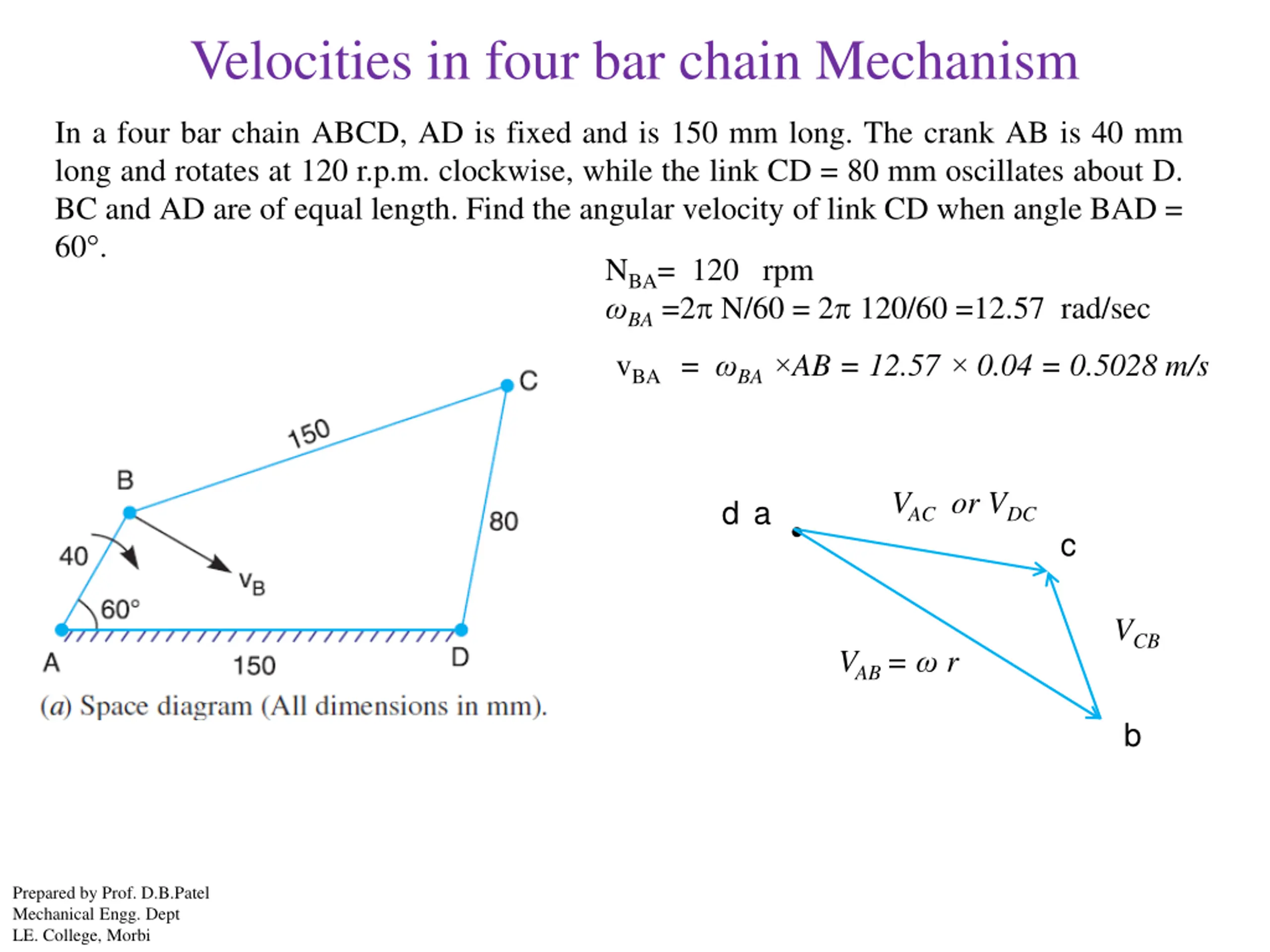 Velocities in four bar chain Mechanism In a four bar chain ABCD, AD is fixed and is 150 mm long. The crank AB is 40 mm long and rotates at 120 r.p.m. clockwise, while the link CD = 80 mm oscillates about D. BC and AD are of equal length. Find the angular velocity of link CD when angle BAD = 60 . NBA= 120 rpm BA =2 N/60 = 2 120/60 =12.57 rad/sec vBA = BA AB = 12.57 0.04 = 0.5028 m/s VAC or VDC d a c VCB VAB = r b Prepared by Prof. D.B.Patel Mechanical Engg. Dept LE. College, Morbi