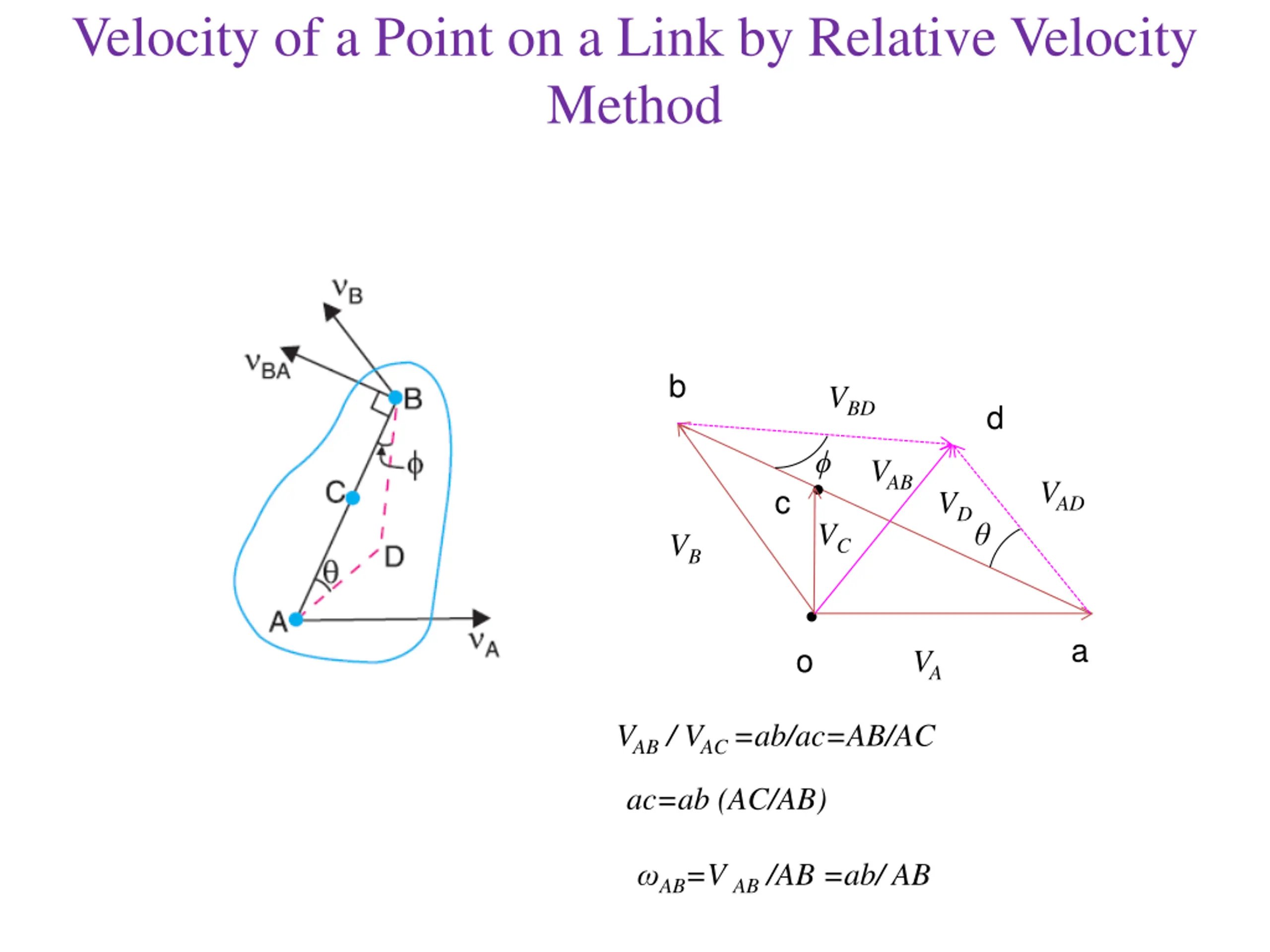 Velocity of a Point on a Link by Relative Velocity Method b VBD d VAB VAD c VD VC VB a o VA VAB / VAC =ab/ac=AB/AC ac=ab (AC/AB) AB=VAB /AB =ab/ AB
