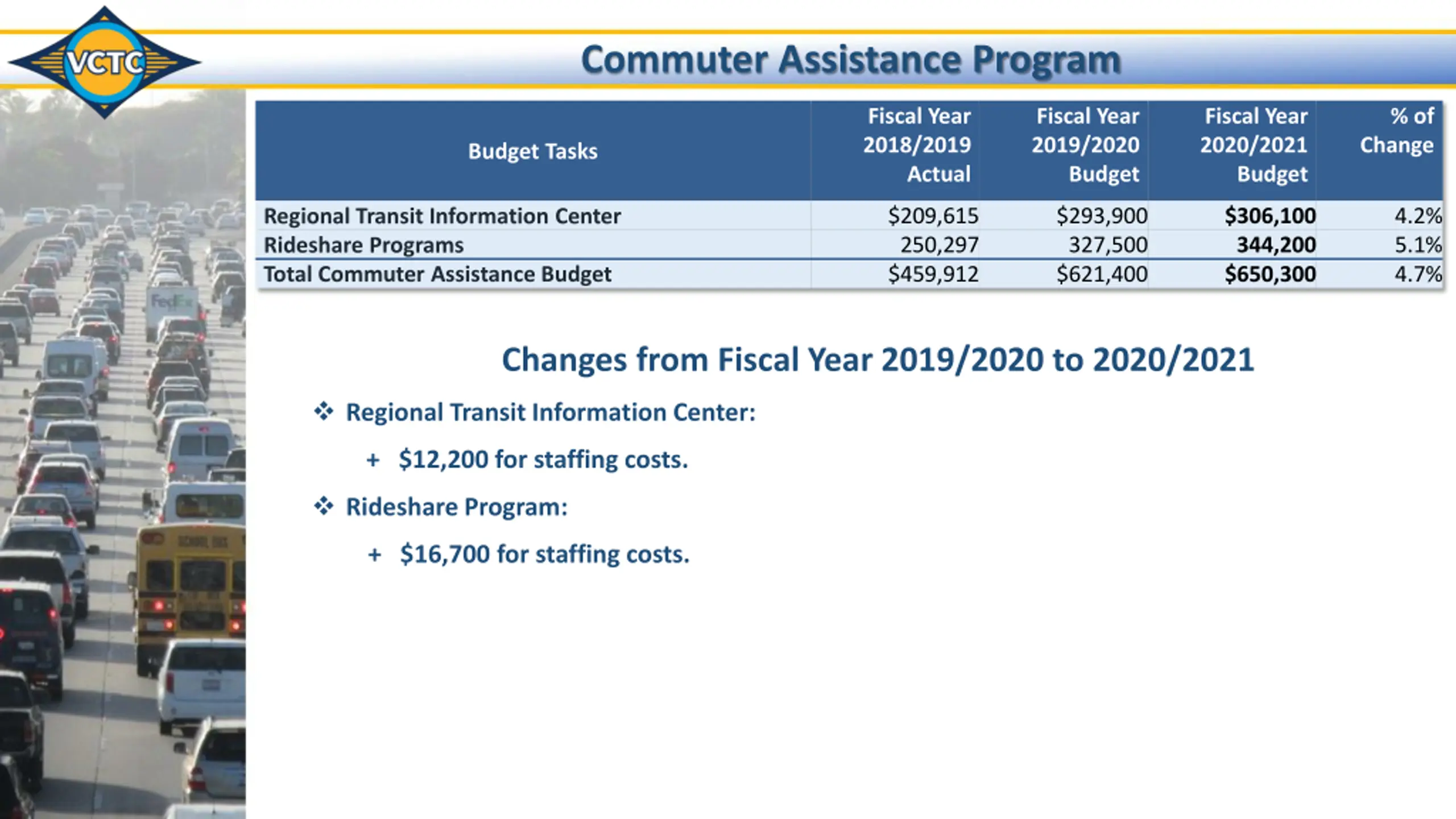 Commuter Assistance Program Fiscal Year 2018/2019 Actual Fiscal Year 2019/2020 Budget Fiscal Year 2020/2021 Budget % of Change Budget Tasks $209,615 250,297 $459,912 $293,900 327,500 $621,400 $306,100 344,200 $650,300 4.2% 5.1% 4.7% Regional Transit Information Center Rideshare Programs Total Commuter Assistance Budget Changes from Fiscal Year 2019/2020 to 2020/2021 Regional Transit Information Center: + $12,200 for staffing costs. Rideshare Program: + $16,700 for staffing costs.